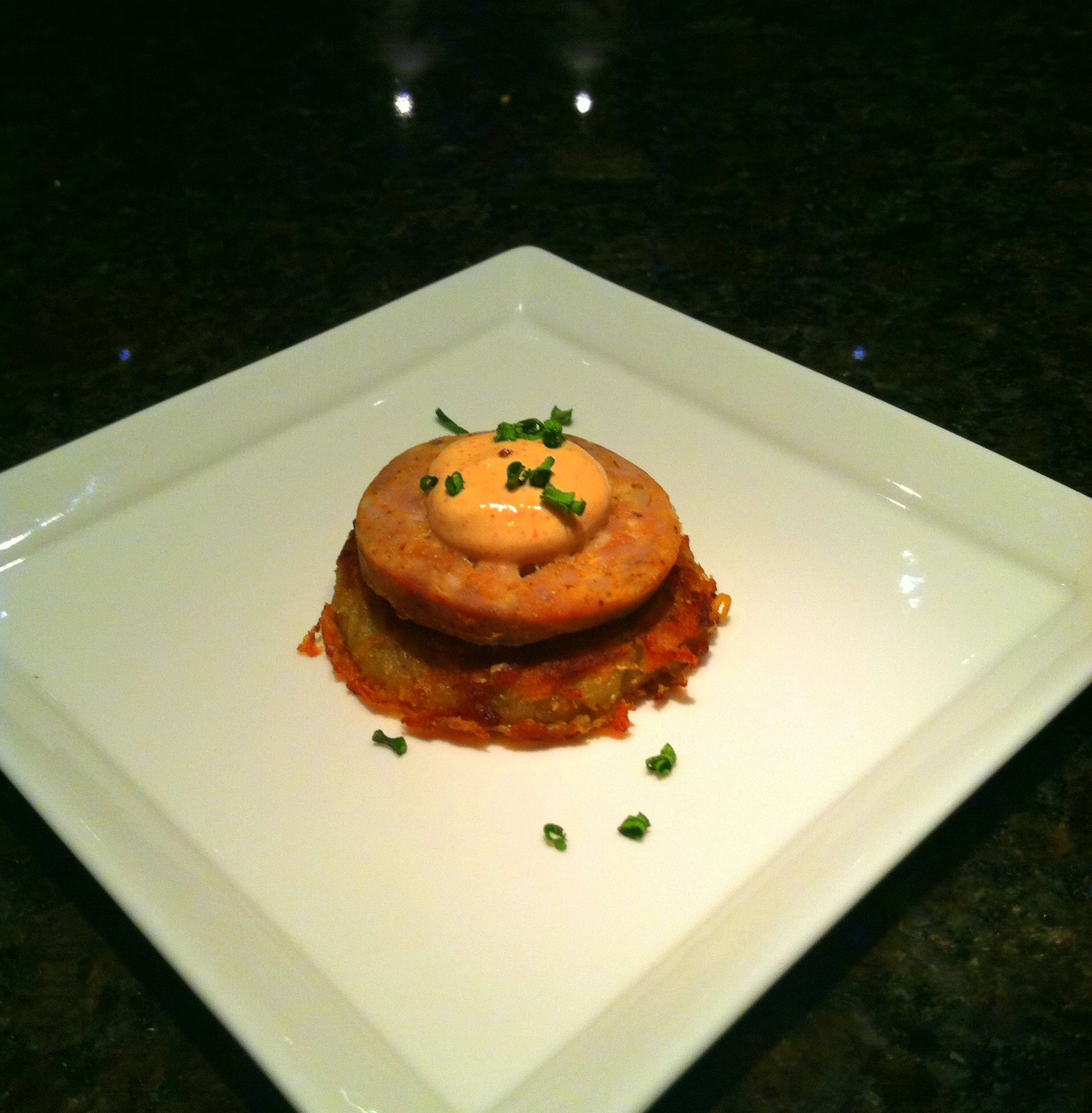 Re-imagining traditional dishes is a hallmark of Great Lakes Cuisine, and this dish provides a fun example. The potatoes of the traditional dish are here served as a potato pancake. The traditional Hungarian sausage is replaced with a home-made version. Both are topped with a smoked paprika sour cream and snipped garlic chives.