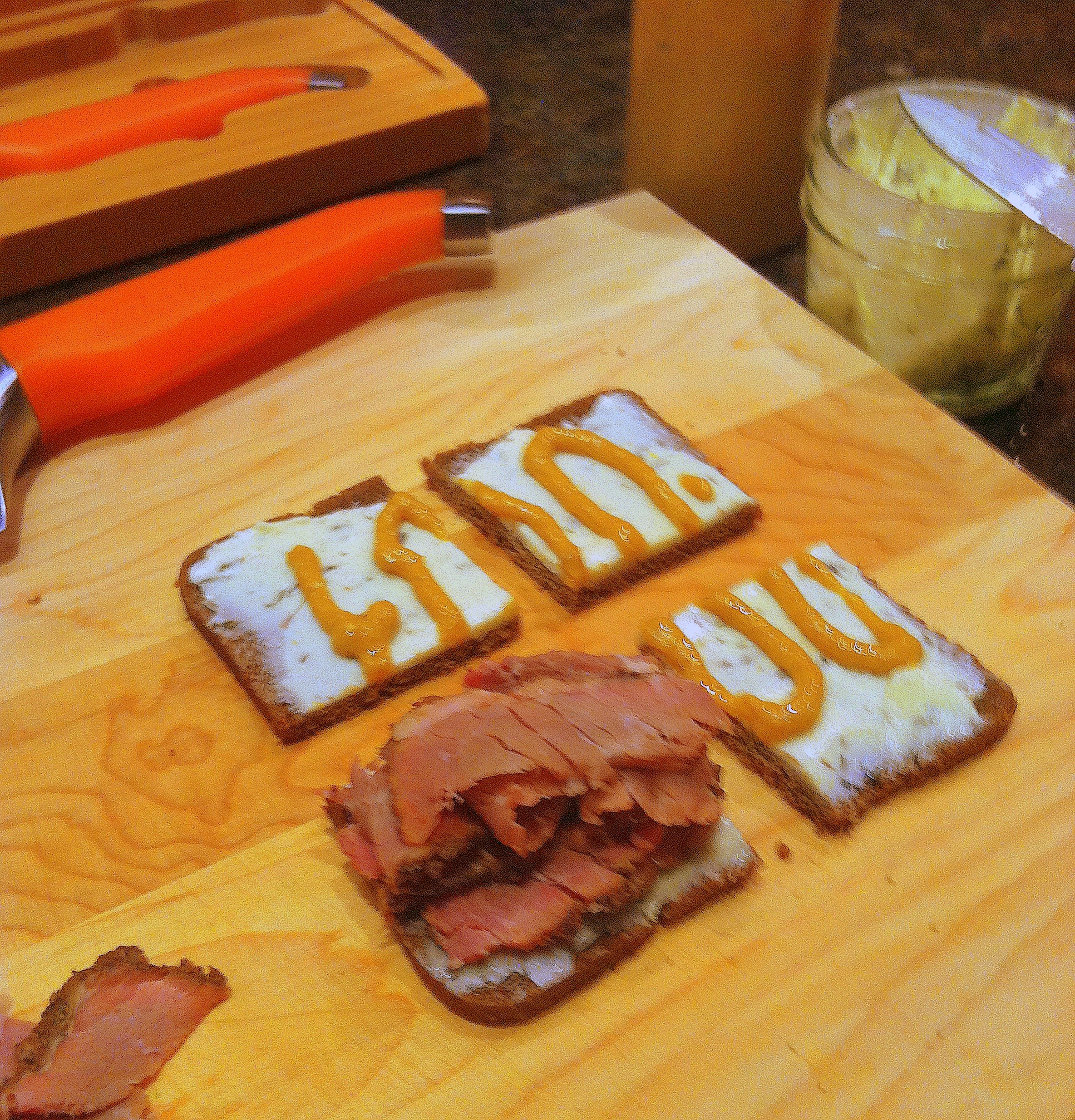 Lakefront Brewing – Riverwest Stein : A beautiful, malty amber lager, which despite their website’s recommendation to pair with German food, we paired with our version of Pastrami on Rye. The pastrami was a gift from my good friend, Tom, which he based on Michael Ruhlman’s pastrami shared at his blog, then smoked on the Green Egg. We returned to our smorrebrod approach we’ve discussed before. We spread a thyme butter on Rubschlager Pumpernickel Rye, add a malt vinegar mustard and then slice into quarters.  Each piece is then topped with the smokey goodness of pastrami.