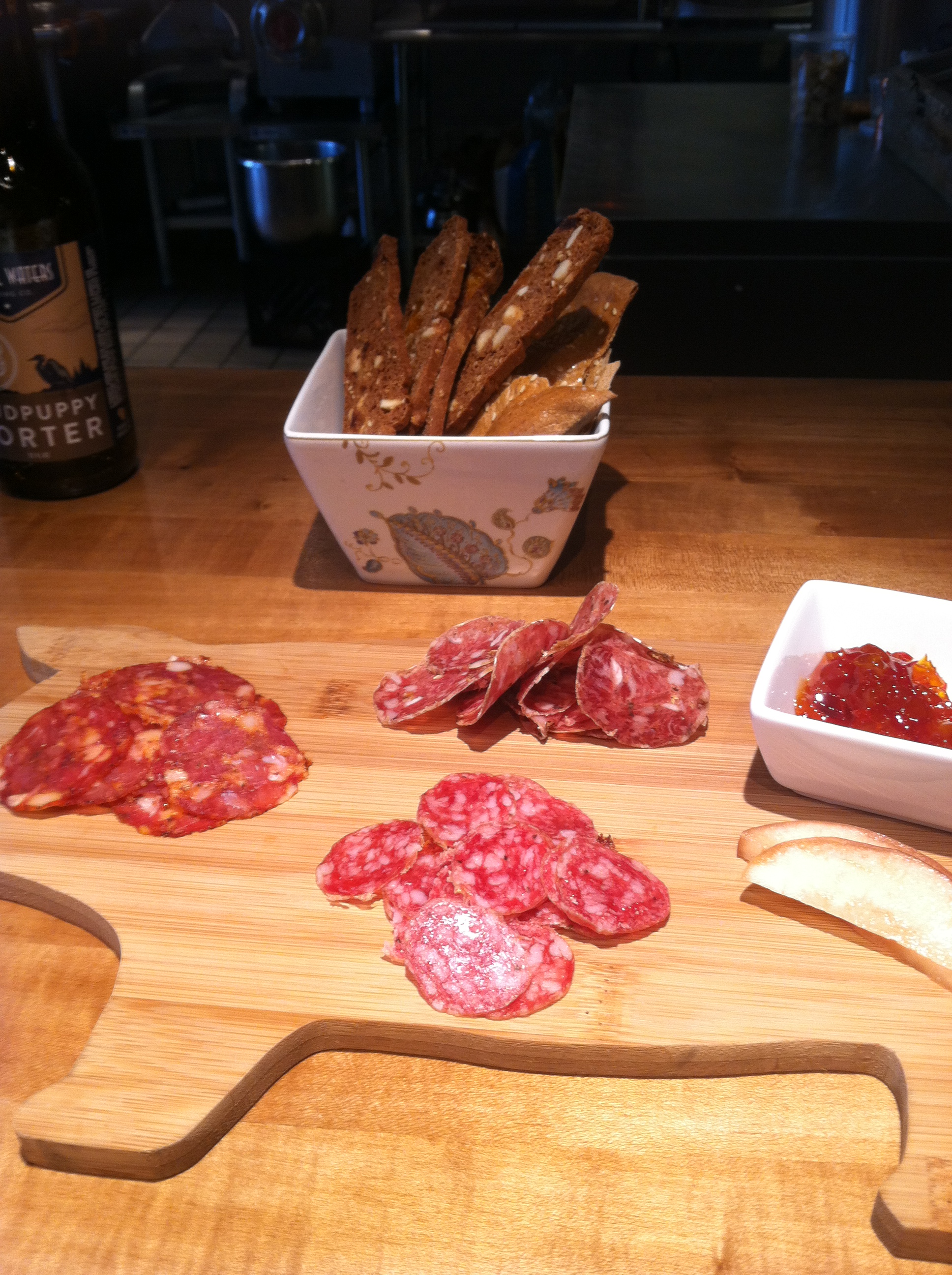 The tongue was rich and brilliantly offset by the tang of the braised red cabbage and the creamy, mustard punch of the poached butternut spread. At this point I had moved on to a scotch-style ale, Dirty Bastard from Founder’s Brewing Co. which was a lovely, malty complement. Particularly nice with an ultra thin slice of bresola, which we got as a little complimentary taste from the chef.