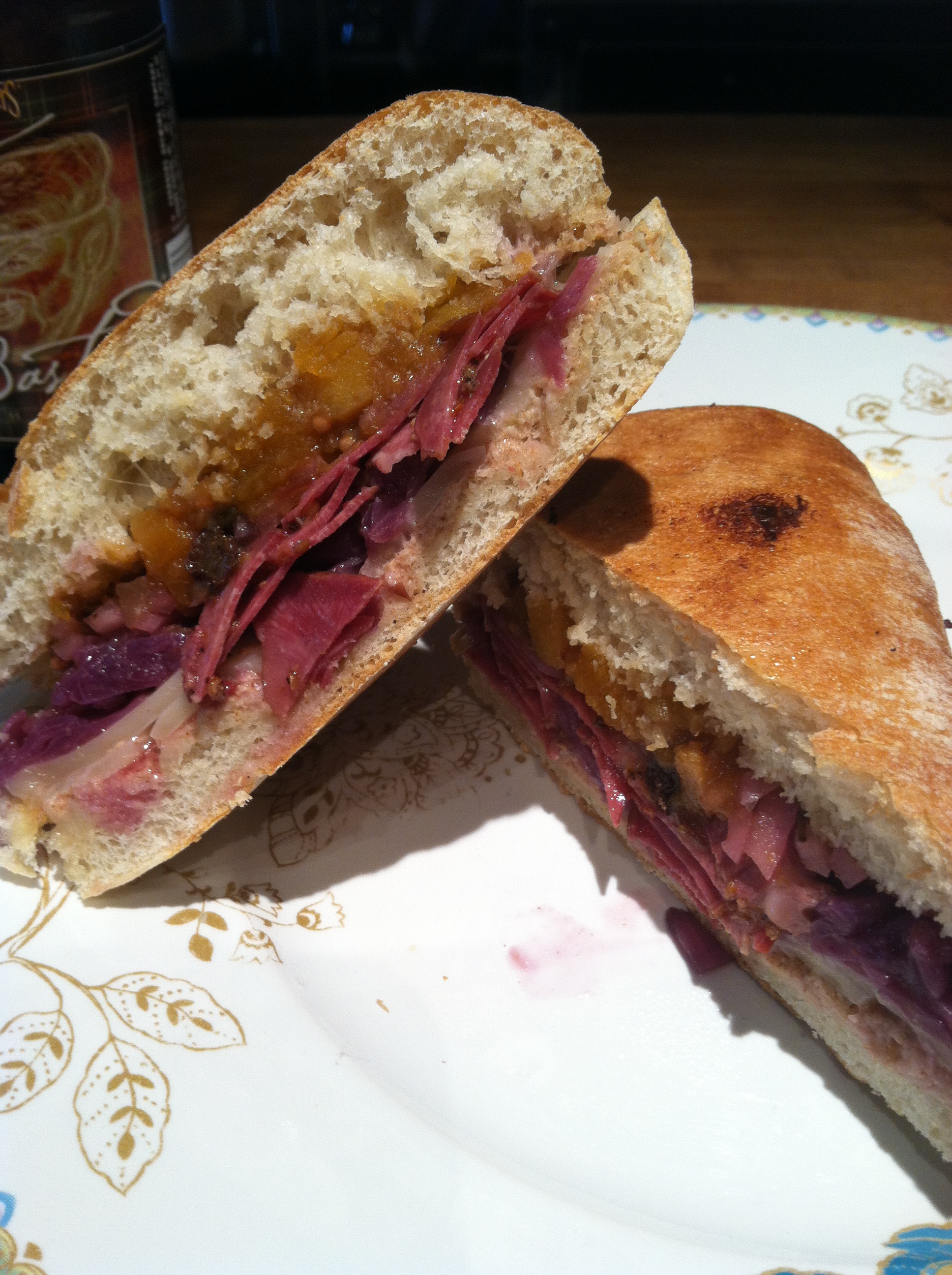The accompaniments were chili-pepper flecked jam, pickled pears, and house crackers. I enjoyed a Central Waters Brewing Co. Mud Puppy Porter with it and was in heaven. And that was before my sandwich. The menu at Bavette is great, filled with so many innovative appetizers, salads, and sandwiches for lunch. For me, the real treat was the diversity of cuts available. Here is where the joy of eating lunch in a butcher shop really comes through. All those cuts that we don’t normally eat on their own need to be highlighted, experimented with, and featured, and this is the ideal environment to do just that. Jay enjoyed a shredded beef cheek sandwich with braised kale and fresh red grapes, but I couldn’t pass on a beef tongue pastrami sandwich with braised red cabbage and a butternut mostarda.