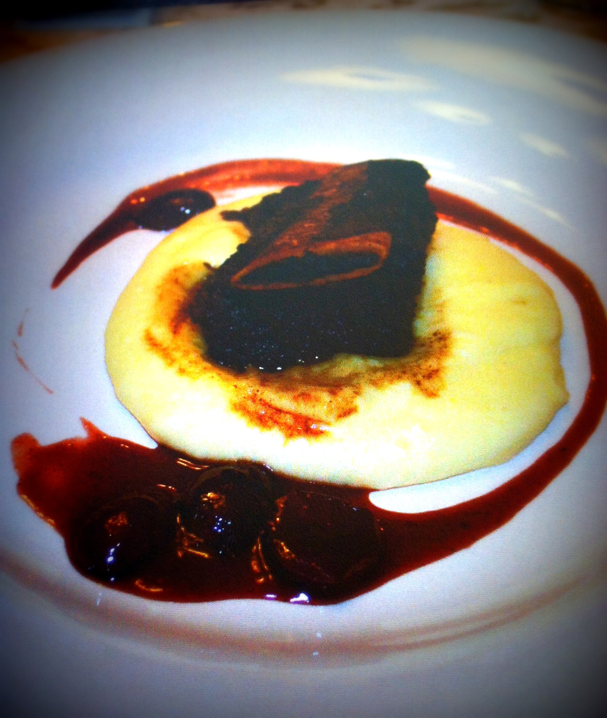 We are quite fond of the combination of cherries with slow cooked meats. The tart, sweet flavors of the fruit offer both contrasting and complementary elements to a savory dish, and slow-roasted meats in particular. We once served an espresso-rubbed beef short rib was served on a dollop of lusciously rich pommes aligot with a ribbon of cherry sauce surrounding the plate. Decadent and beautiful (and a hat tip to my buddy Tom who co-created the dish).