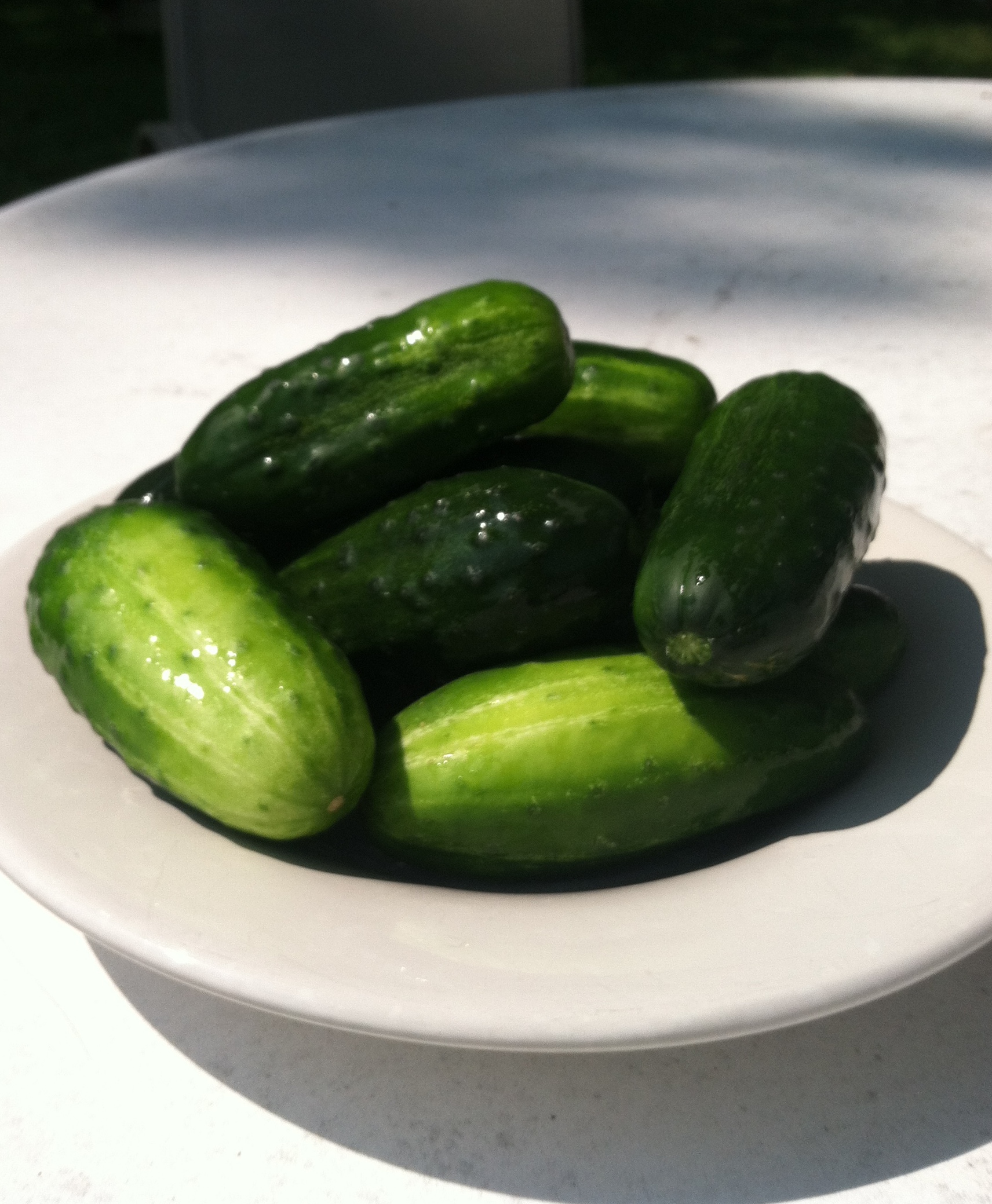 Two cups vinegar, one cup sugar, 2 tablespoons pickling spices from Penzey’s. Boil, then chill. Slice the cukes thin, toss into the brine, wait a few hours. You get this.