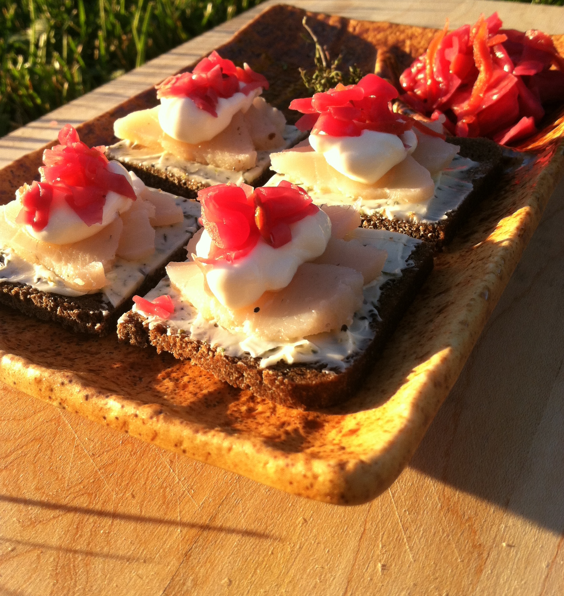 Dark rye, herb butter, pickled pike, sour cream, pickled red cabbage.