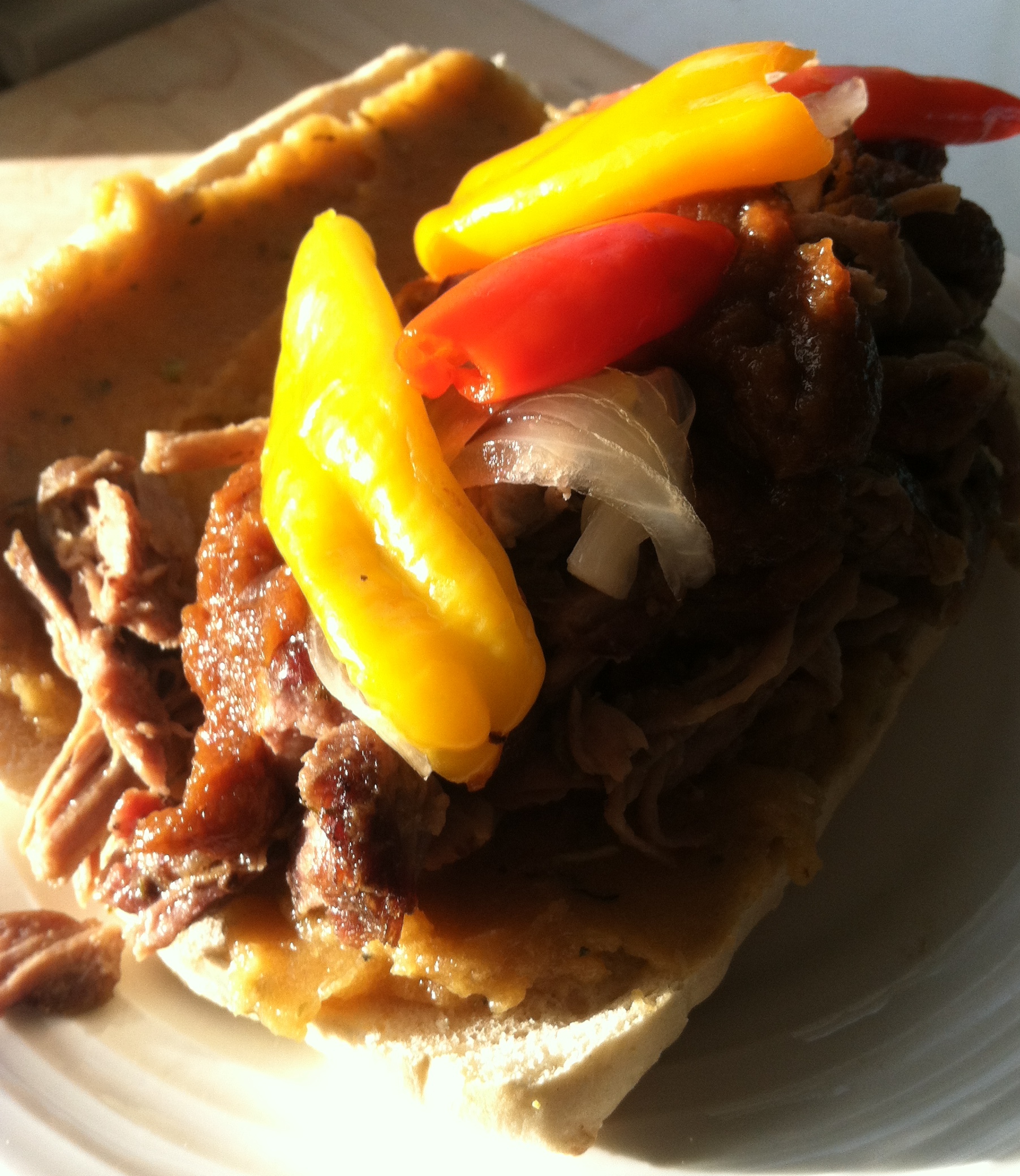 The pork roast was shredded by hand, removing any difficult sinews and excessive fat, then reheated. We added home-pickled sweet peppers instead of the hot sauce Mario had in mind. The result: