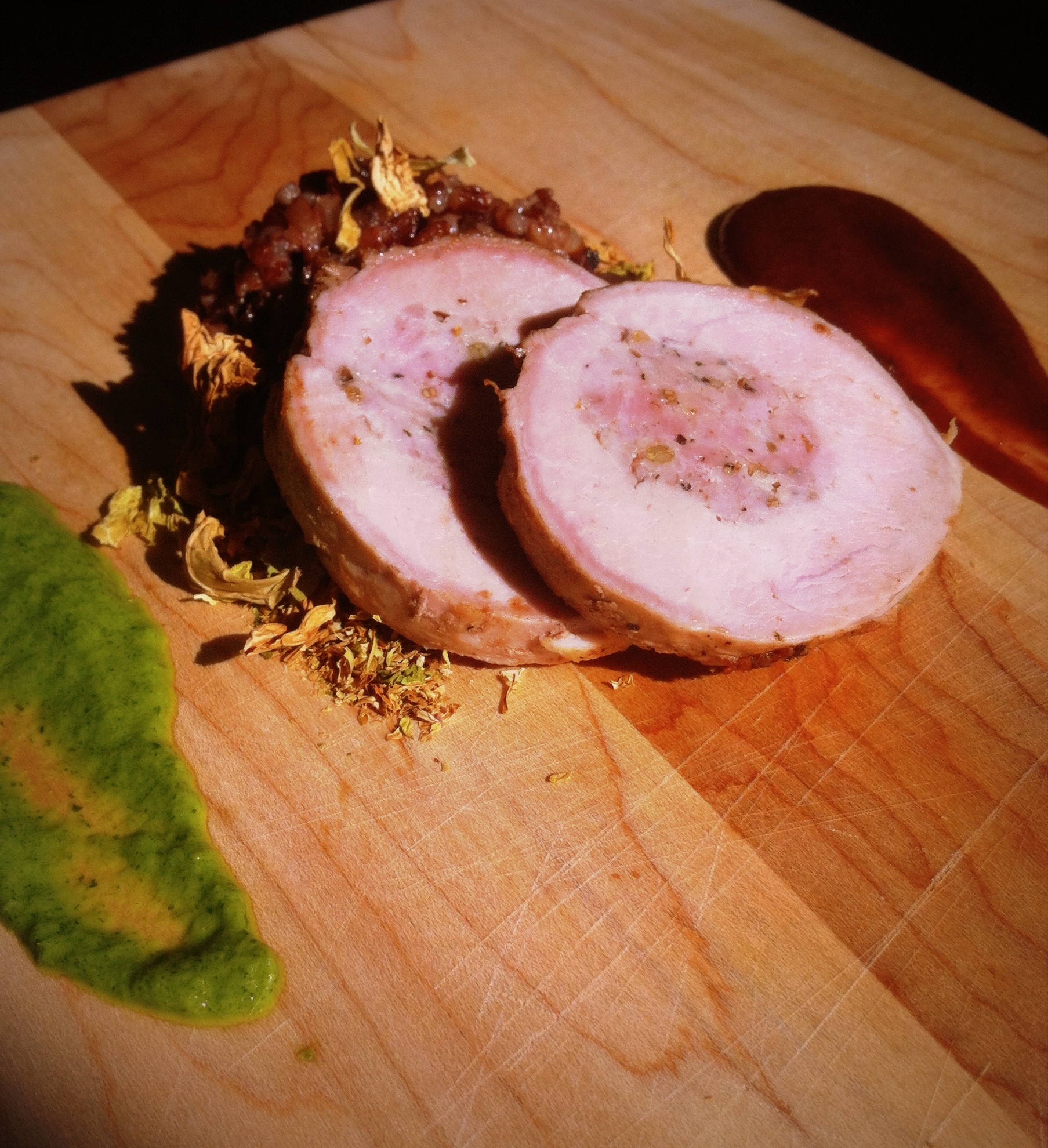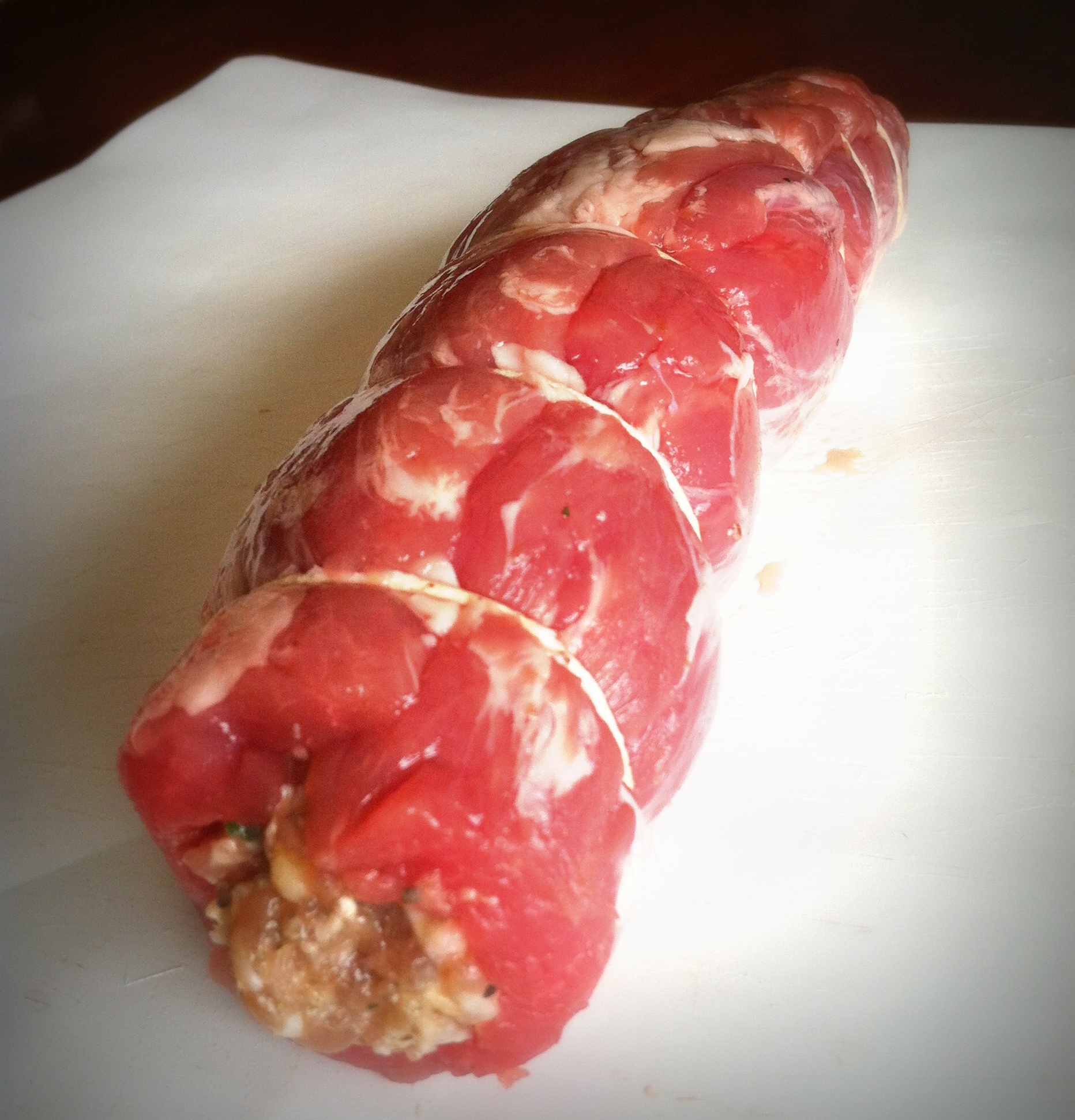 Butterfly the pork tenderloin (slice along the length, but not entirely through) and lay it open on the cutting board. Cover with a gallon plastic bag (works better than plastic wrap) and pound out until pork loin is approximately ½ inch think. Layer the stuffing own the middle of the pork, roll, and tie with butcher thread. Chill stuffed tenderloin until 1 hour before cooking. The result should be something like this: