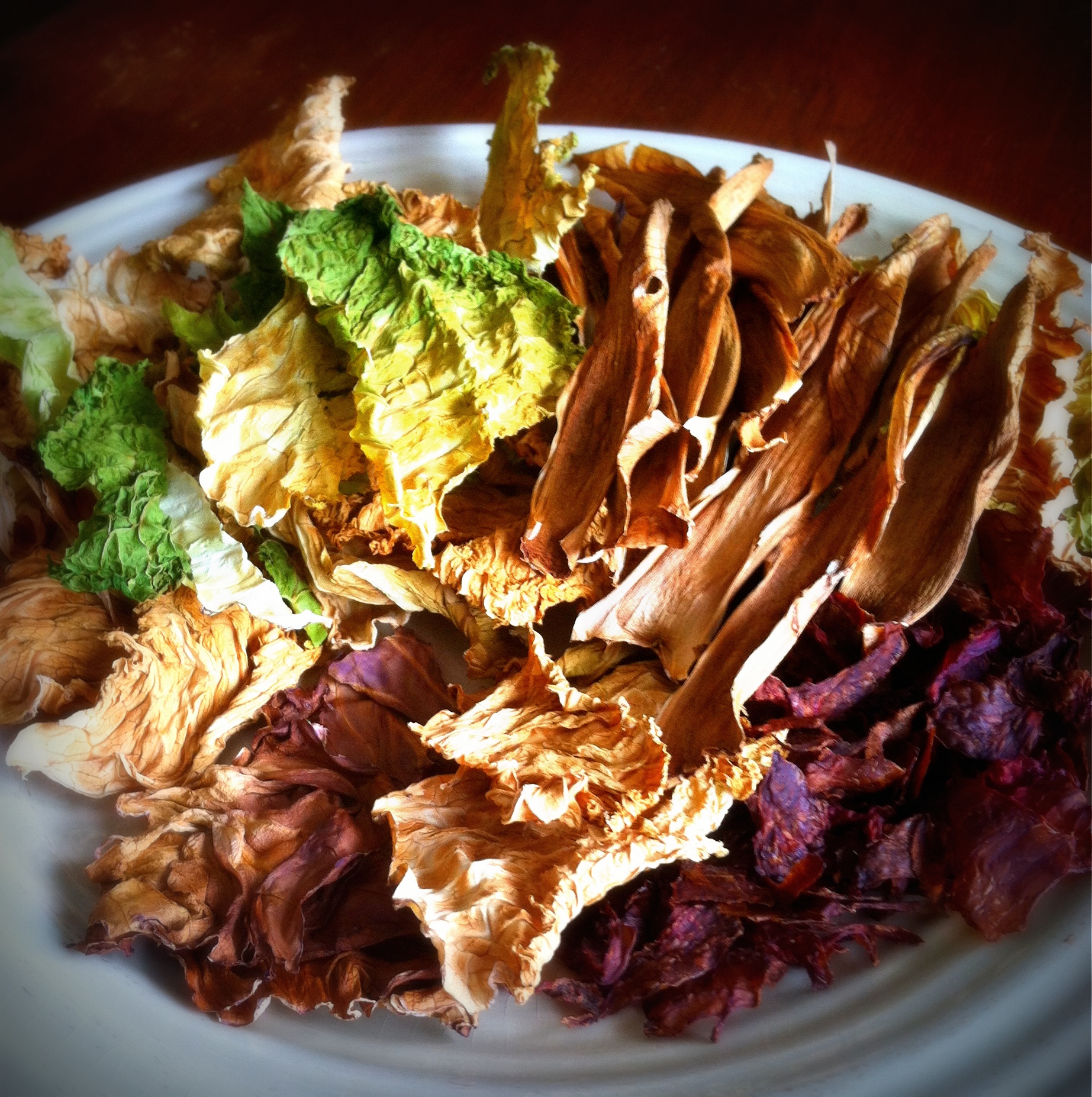 The oven dried greens we have done before with kale and chard. Taking advantage of an oven set to 250°, this time we also dried radicchio, endive, and even red cabbage sauerkraut. The radicchio was uninspiring, largely flavorless and the red color faded to brown. The endive was bitter. The red cabbage sauerkraut had caramelized, but still retained a lovely sour tang.