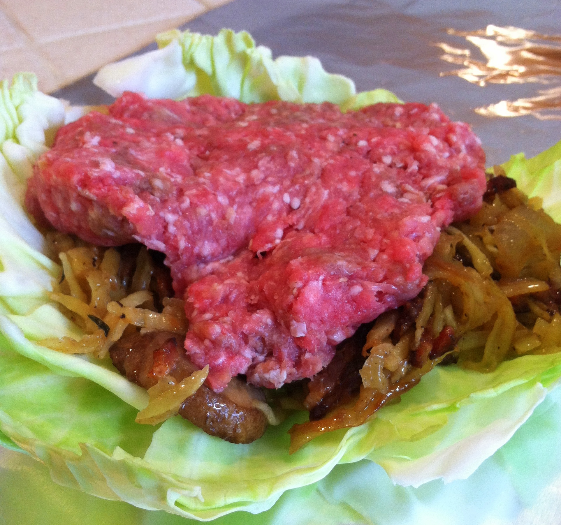 Now, we can’t re-create the feeling of camping with friends, under the star-lit skies of Upper Michigan, but we decided to make a stepped-up version of the classic camp dinner. There are a couple of issues with the classic tin din – the cabbage typically burns, the potatoes are often underdone, and ranch dressing is not my personal preference for a sauce for hamburger. We decided to shred the potatoes and then par-cook them with onions and cremini mushrooms with a bit of thick-cut bacon from Angeli Foods in Iron River.