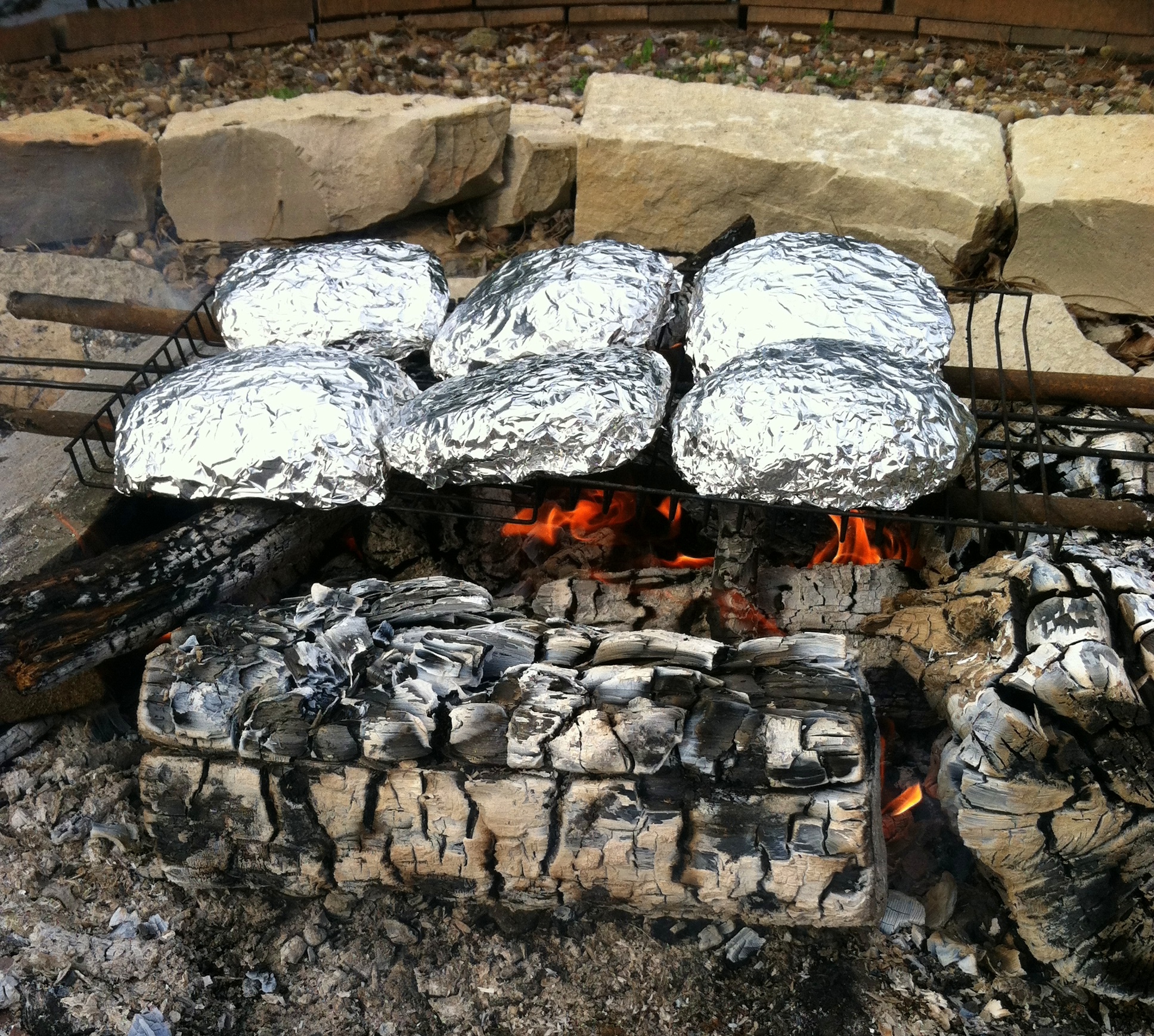 The campfire had burned for about an hour before we decided to add the tin dins. Knocking down the fire and then layering a grate across a couple of logs allowed us to keep the packets up off the direct embers to cook the packets a bit slower and keep our cabbage from burning.