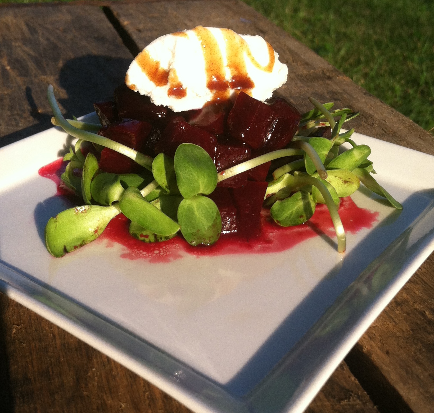Oven roasted beets with Milwaukee Craft Brew Vinegar’s American Amber vinegar and buckwheat honey vinaigrette served on Growing Power sunflower sprouts with chèvre and a malt vinegar glaze.