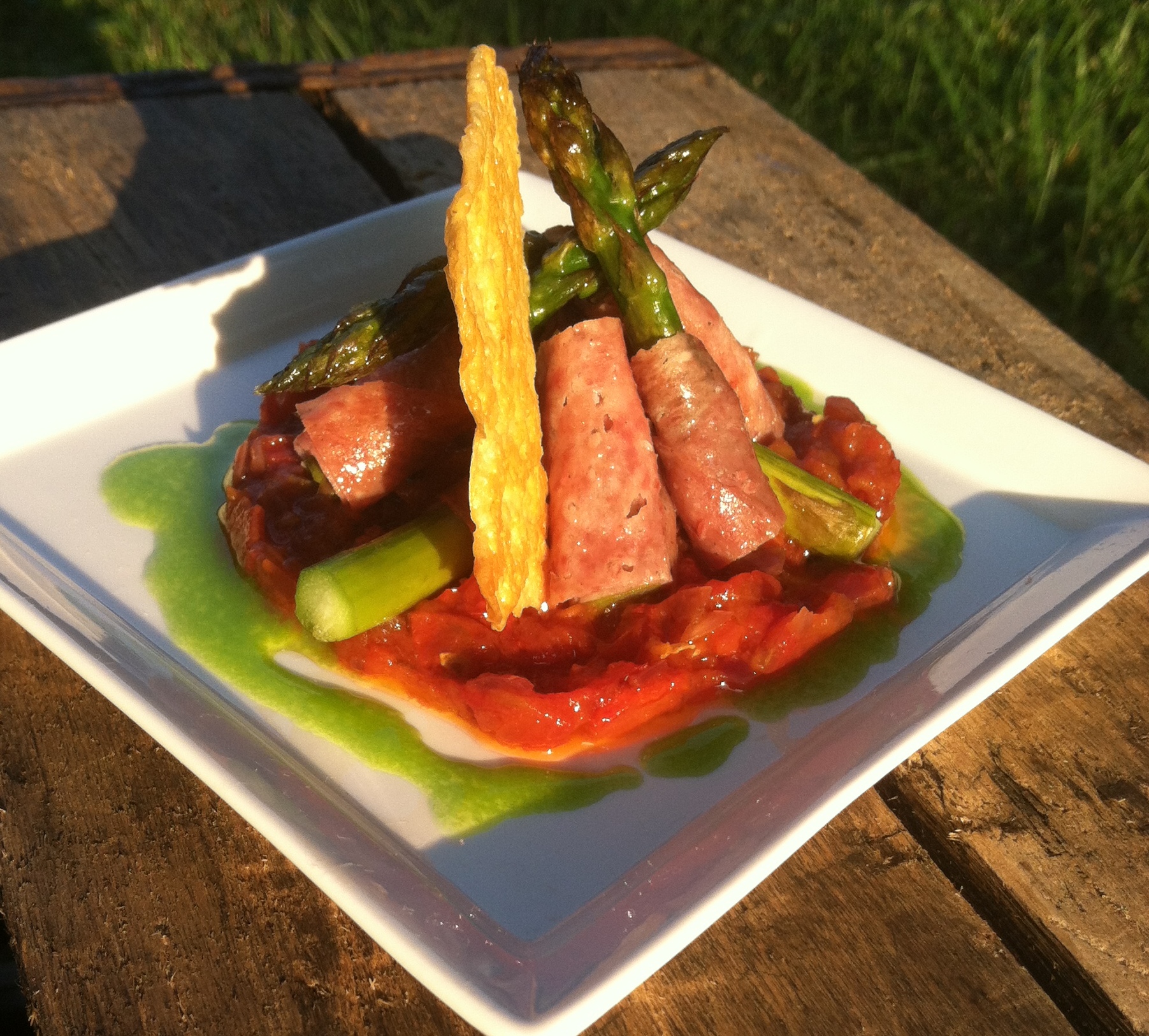 Roasted tomato tartar, salami-wrapped grilled asparagus, chive oil, Parmesan crisp. This owed inspiration to a Thomas Keller dish which he serves with dressed haricot vert.