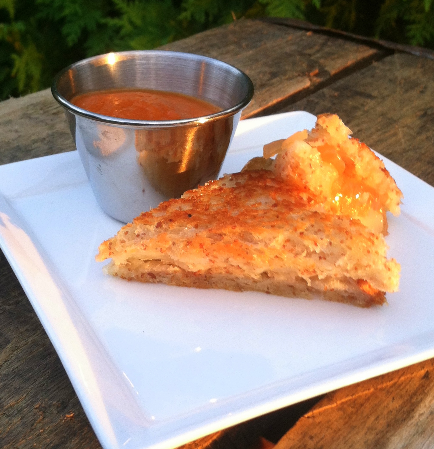 Grilled cheese with goat cheddar from Carr Valley and caramelized onions with a tomato “soup”, which was a puree of oven-roasted tomatoes and red onions. Tom and I have made a version of this in the past, though that past version benefited from an amazing onion and fennel jam Tom had created.