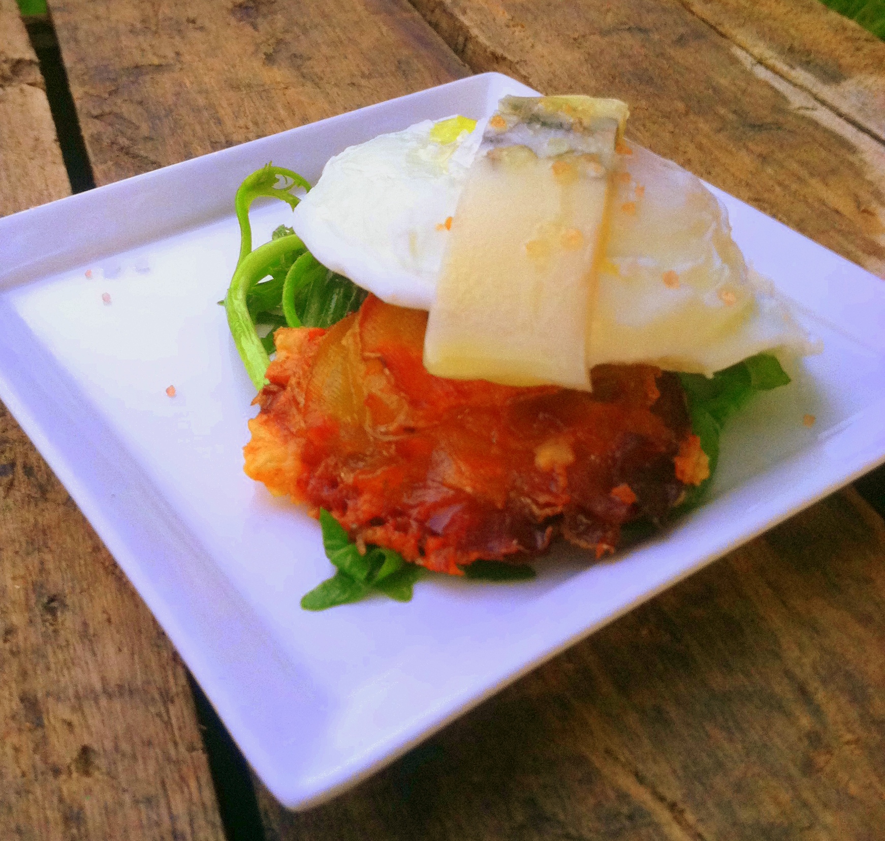 “Au gratin” potatoes – thin sliced Yukon gold potatoes were stacked with a blend of shredded Carr Valley Mobay and Menage between each slice, then oven roasted until crisp. The oils released in cooking were used to wilt arugula, used as the bed of the dish. Topped with a poached egg, the dish is then topped with another strip of Mobay.