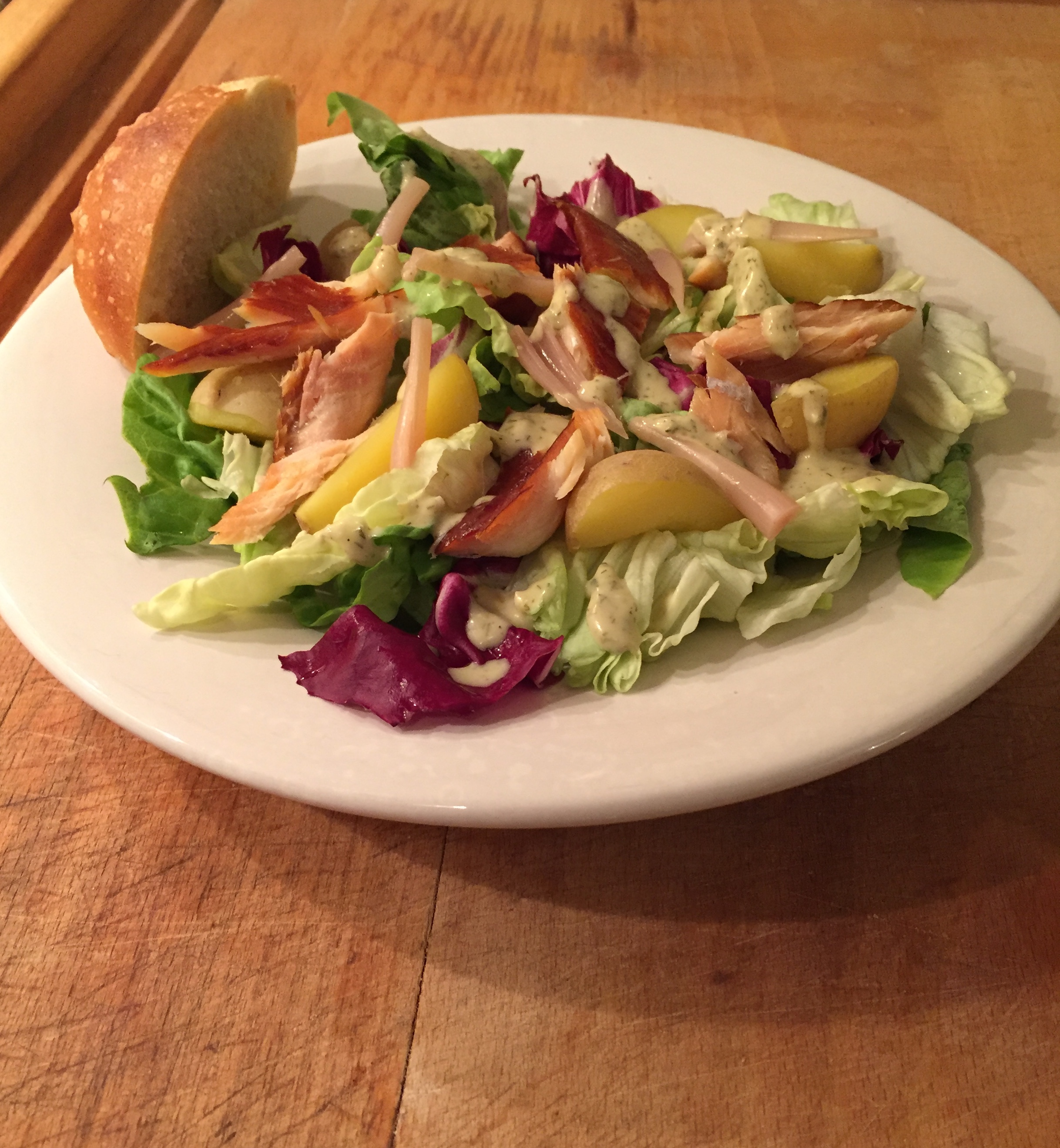 We served this without the traditional green beans, and I would definitely recommend adding them if you have them fresh. Just a quick poach and then ice bath to keep them bright green with a bit of crunch. A creamy house-made dressing with plenty of dill and lemon brings it all together.