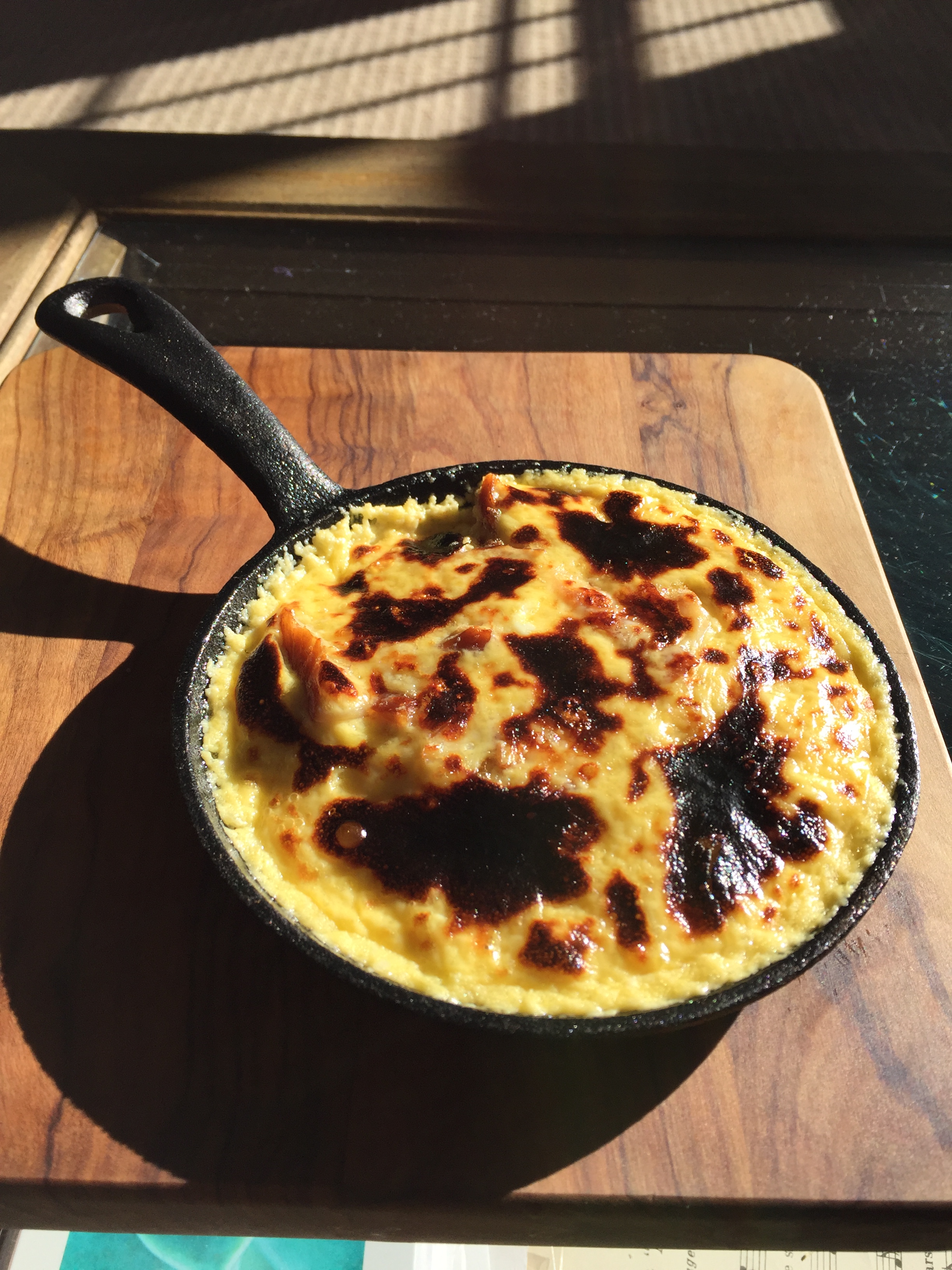 Our recipe here is adapted from a dish made by Tom Kerridge on the U.K. cooking show, “My Greatest Dishes” (S1, Ep3) which he calls his smoked fish omelet. We’ve been doing variations on frittata for years – simply sauté some savory ingredients in a bit of oil and butter, add about eight eggs whisked with cream, them top with cheese and pop into an oven at 350F until set. Growing up, we just called that baked eggs. Of course then it was usually just a can of cream of mushroom mixed into the eggs and baked. Similar process here but Kerridge adds a bit of a twist to the topping which is quite luxurious in mouthfeel and flavor. We copied his service approach of using a small cast iron pan. Please search out Chef Kerridge’s video if you have an interest in duplicating this dish.