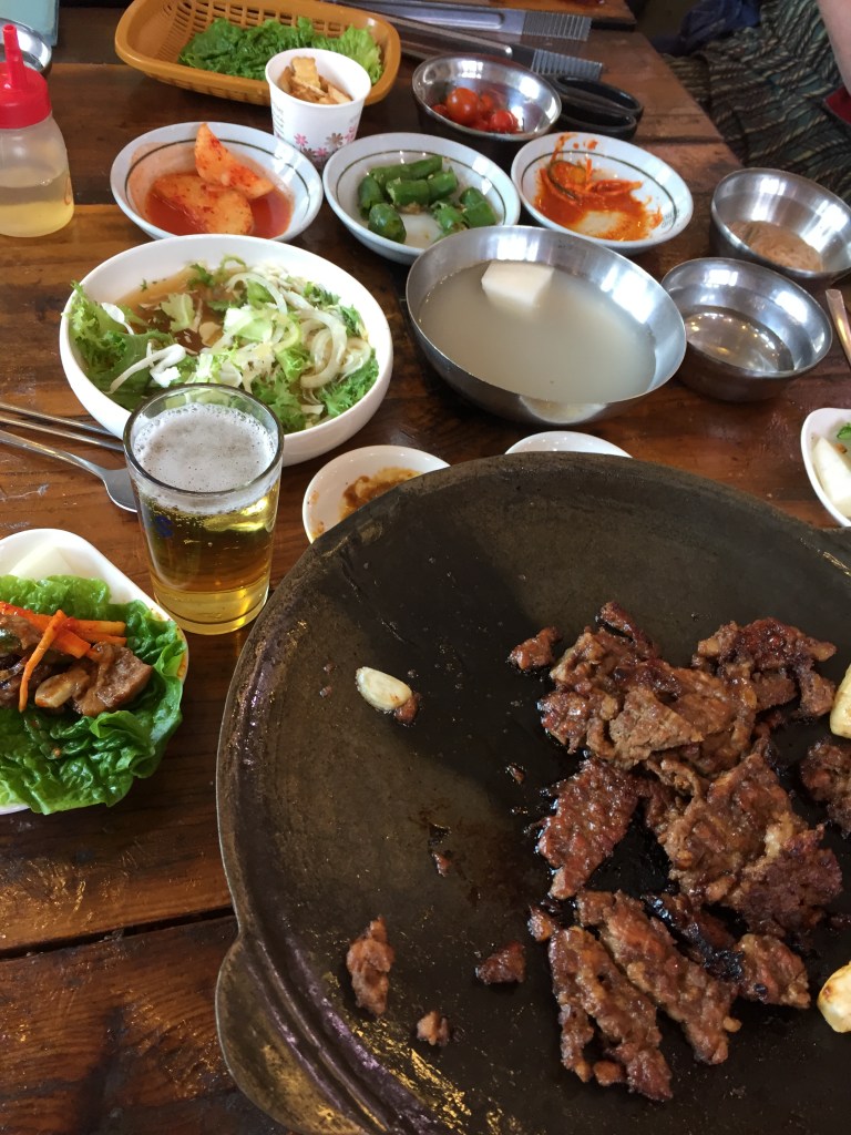 Another day we enjoyed the build-your-own adventure of bulgogi, table side barbeque of tenderized beef, served with more pickled and fresh vegetables with lettuce leaves as the delivery vehicle for all this flavor.