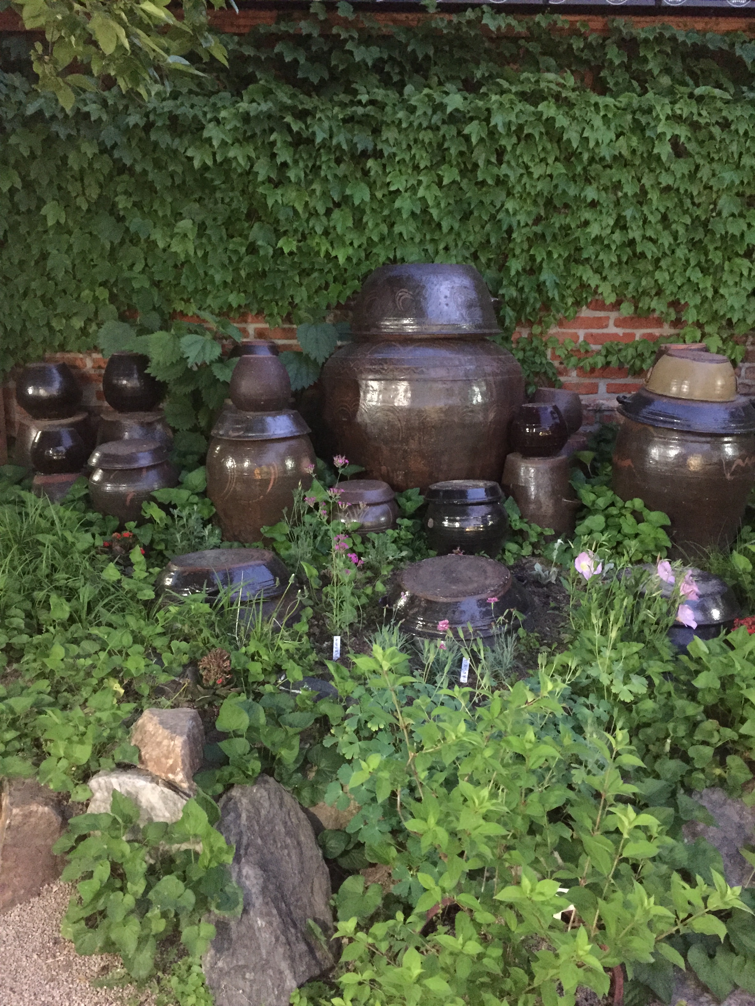 Heavy, hand-made clay pots. Each filled with fermenting vegetables of one type or another. A clay disk on top of each allowing for gas to escape but no critters to get in. All set in the earth, surrounded by herbs. This is perhaps one of my most cherished images of Jeonju, though perhaps my recollection is biased based on the meal that was to come.