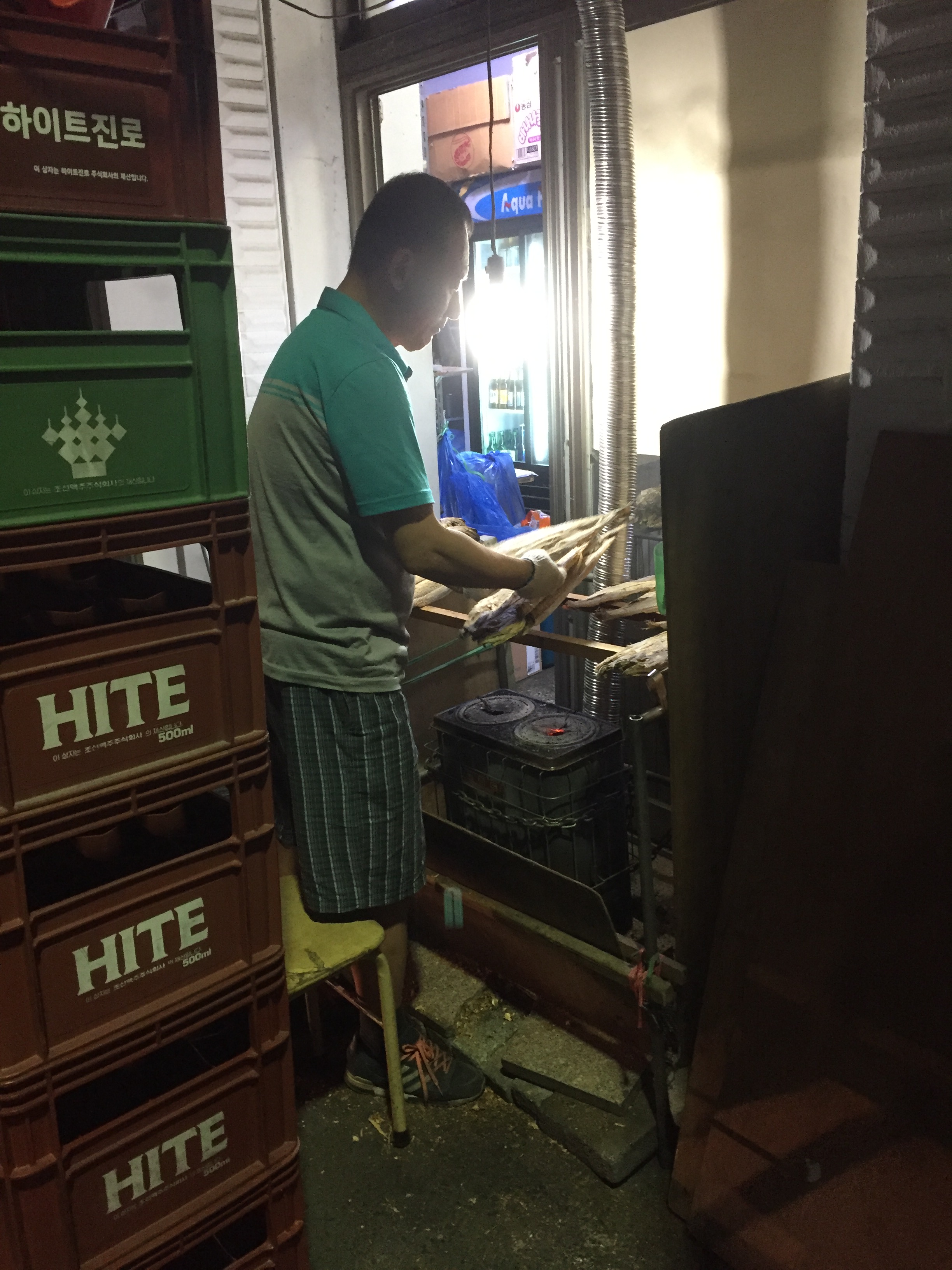 All is revealed after we sit down on our plastic chairs at folding tables. A round of drinks, mostly soju, but more Hite lager for me, and then our snack.