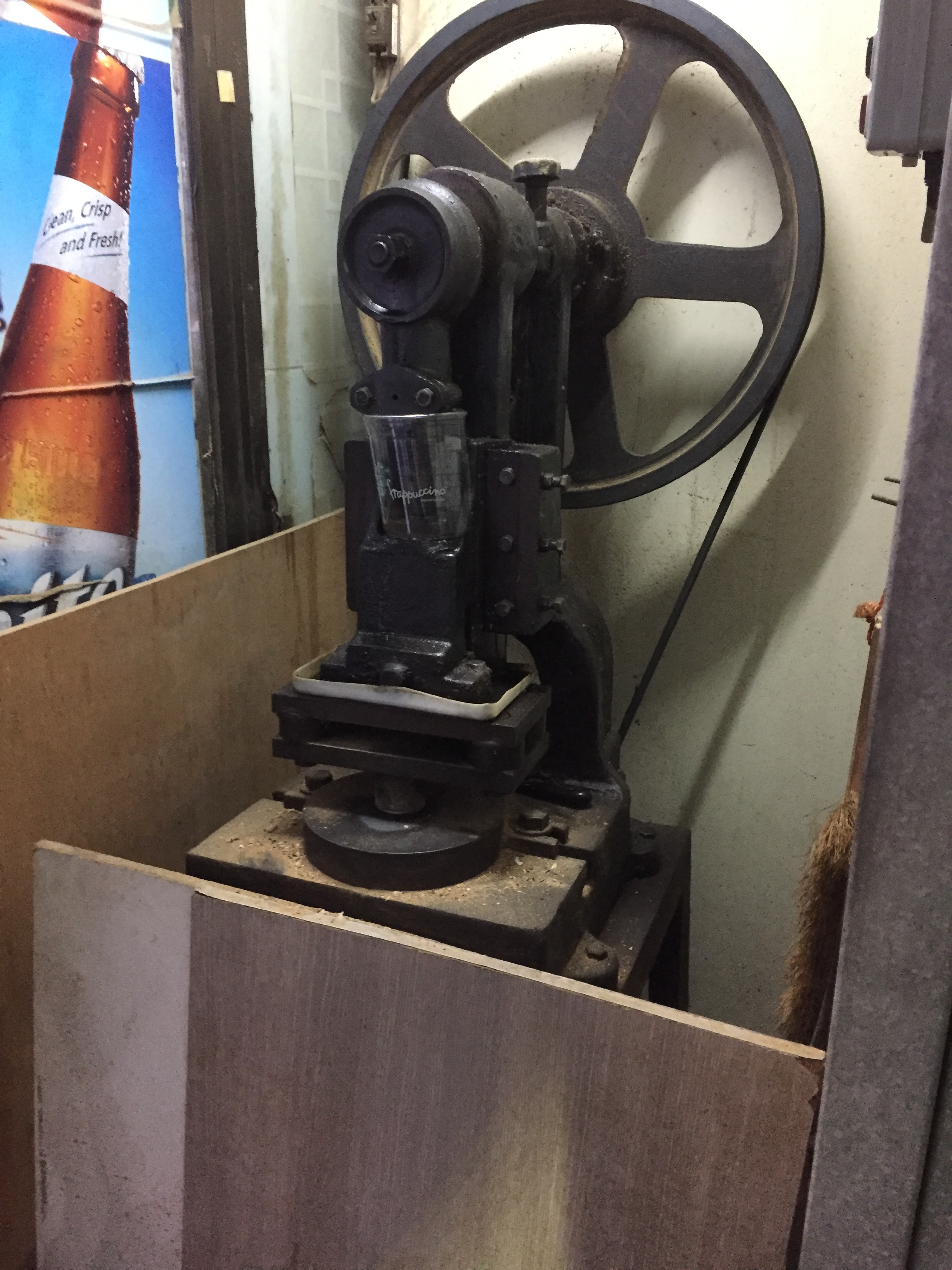 As we approach, we catch a glimpse of the makeshift kitchen, really just storage crates blocking out the breeze so the tiny charcoal stove can heat the snacks. It isn’t entirely clear what they are at this point. Also, why is there an industrial press in the front entry way?