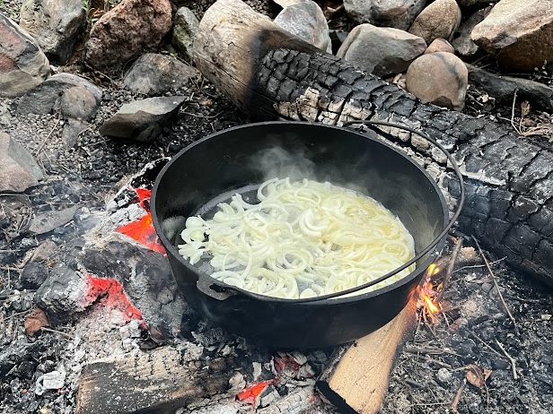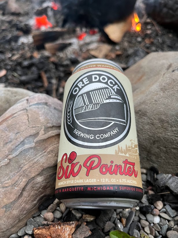 We have a large cast iron pan specifically for cooking over the campfire, which is a nice bed of coals from local hardwoods. After the onions simmer in butter until they are starting to slightly caramelize on the edges, we add about a 1/2 cup of a dark lager to steam the onions a bit more and prevent burning over the fire. In this case we used Six Pointer, a Munich dark from Iron Dock Brewing which we picked up at the brewer while in Marquette.