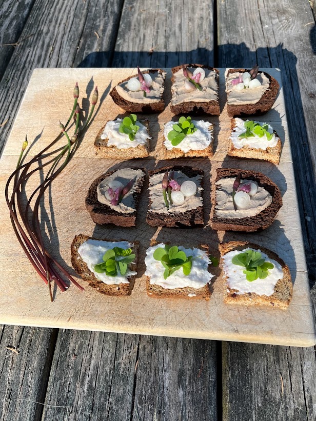We served the whitefish mousse on caraway rye toasts with wood sorrel, which adds just a hint of lemony flavor. Playing off the traditional cornichons often served with pâté, we served that on pumpernickel toasts with pickled wild leek bulbs and scapes (h/t Alan Bergo, Forage Chef). The liver pâté definitely had similarities to chicken liver pâté we had done in the past, that deeply rich, uniquely liver taste with perfectly creamy mouthfeel. More Iron Dock Brewing Blond Ale on hand is the perfect complement.
