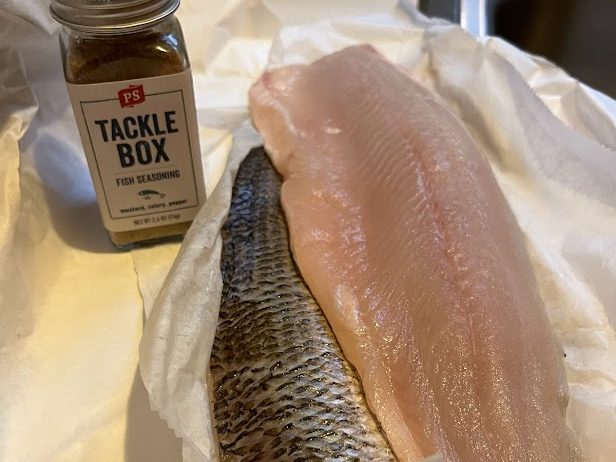 One of my fondest memories of food involves catching rainbow trout in a mountain lake in Colorado, cleaning the fish at the campsite and then cooking over a fire, sauteed in onions and a brown ale. This delicate whitefish deserves the campfire treatment. Unlike at the campsite, here at the cabin we have access to PS Seasoning’s Tackle Box Fish Seasoning, a good blend of mustard, celery, and pepper. The fish has been de-scaled and we’re cooking the fillets with the skin-on.