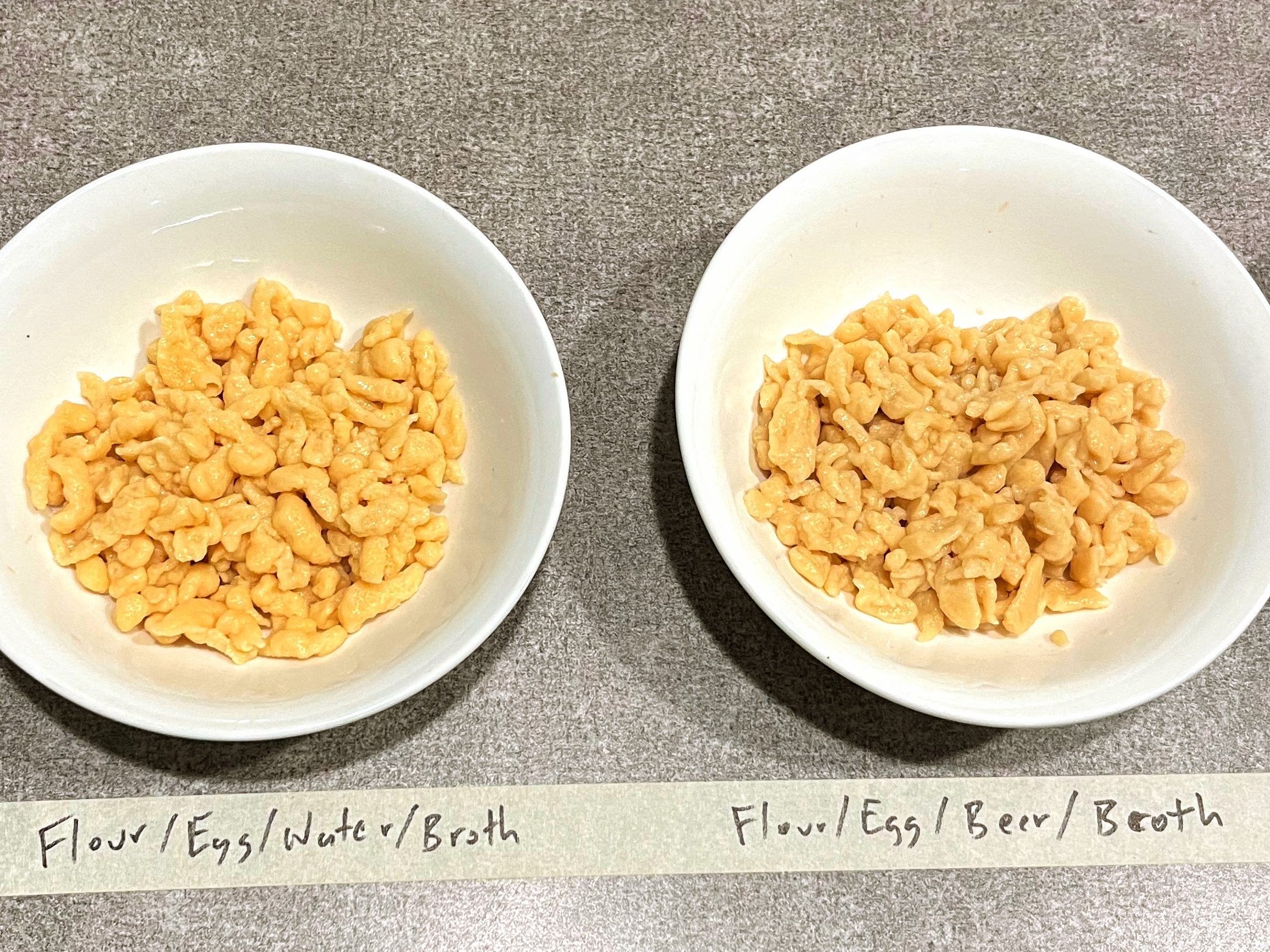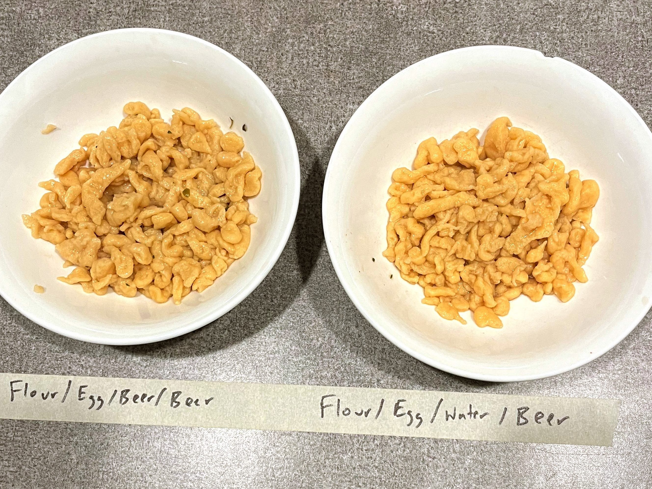 Starting at the very beginning, we did a simple side-by-side to explore the different approaches of using a light beer. For this experiment we went with a Spare Time from Good City Brewing in Milwaukee, WI. It’s a hazy India Pale Ale, with nice hop notes of citrus and herb, used two different ways in our simplest spaetzle: