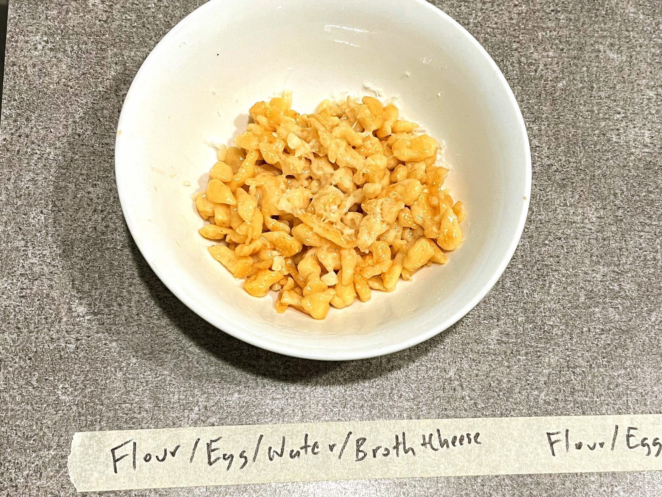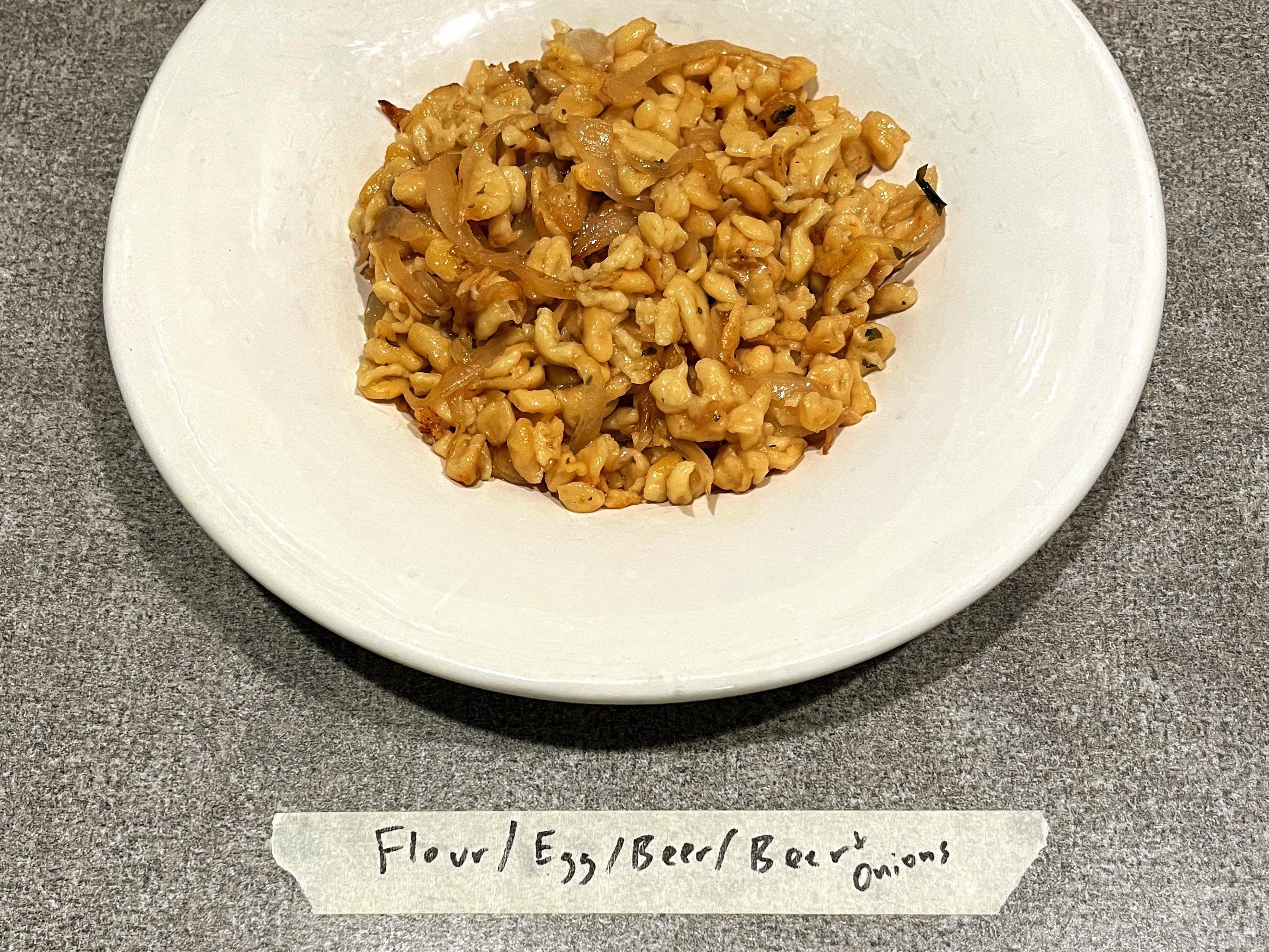 We have featured spaetzle in the past, but a recent dish got us to thinking – what innovations are possible here? Given that innovations in foods are nearly limitless, and taking liberties with any source of inspiration runs the risk of going so far the original inspiration is no longer visible, we elected to explore simple “first-order” variations. What if we simply change one ingredient to a relatively related replacement? For example, instead of wheat flour, let’s use rye flour. Instead of finishing by frying in butter, let’s finish by baking with cheese.