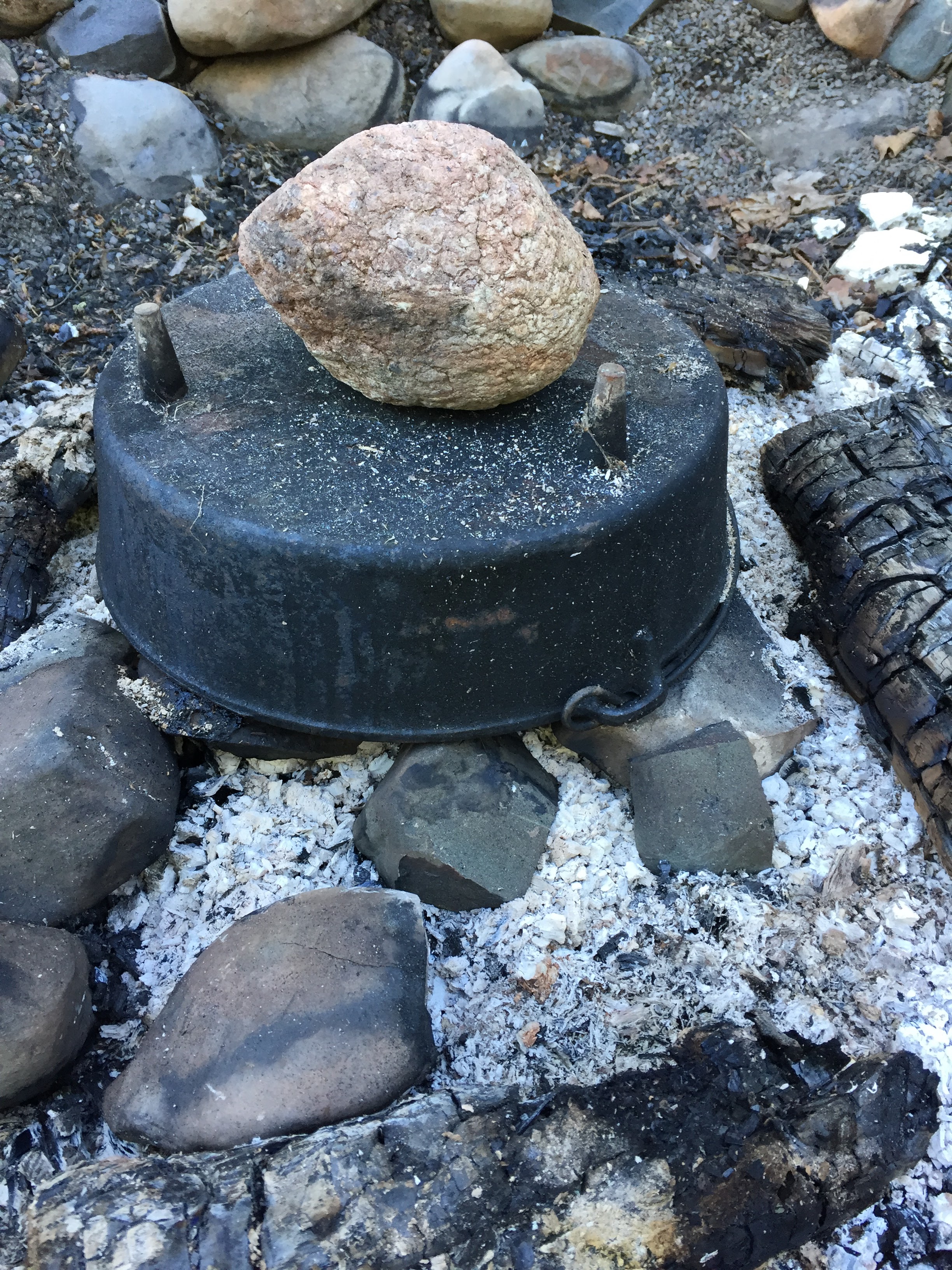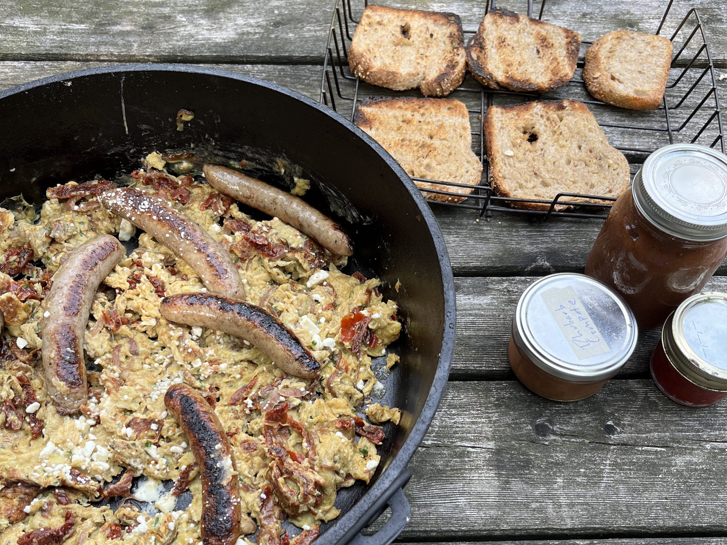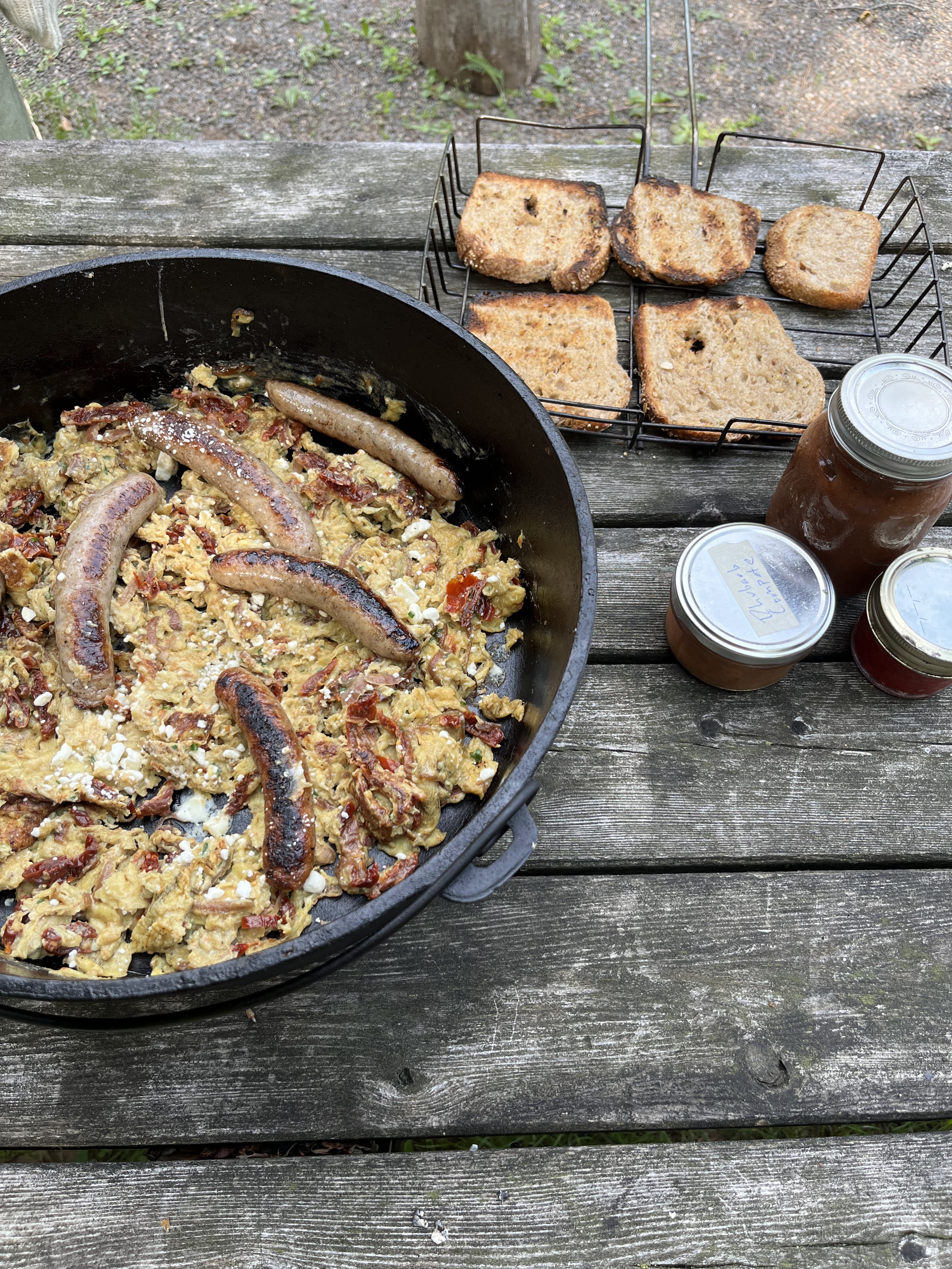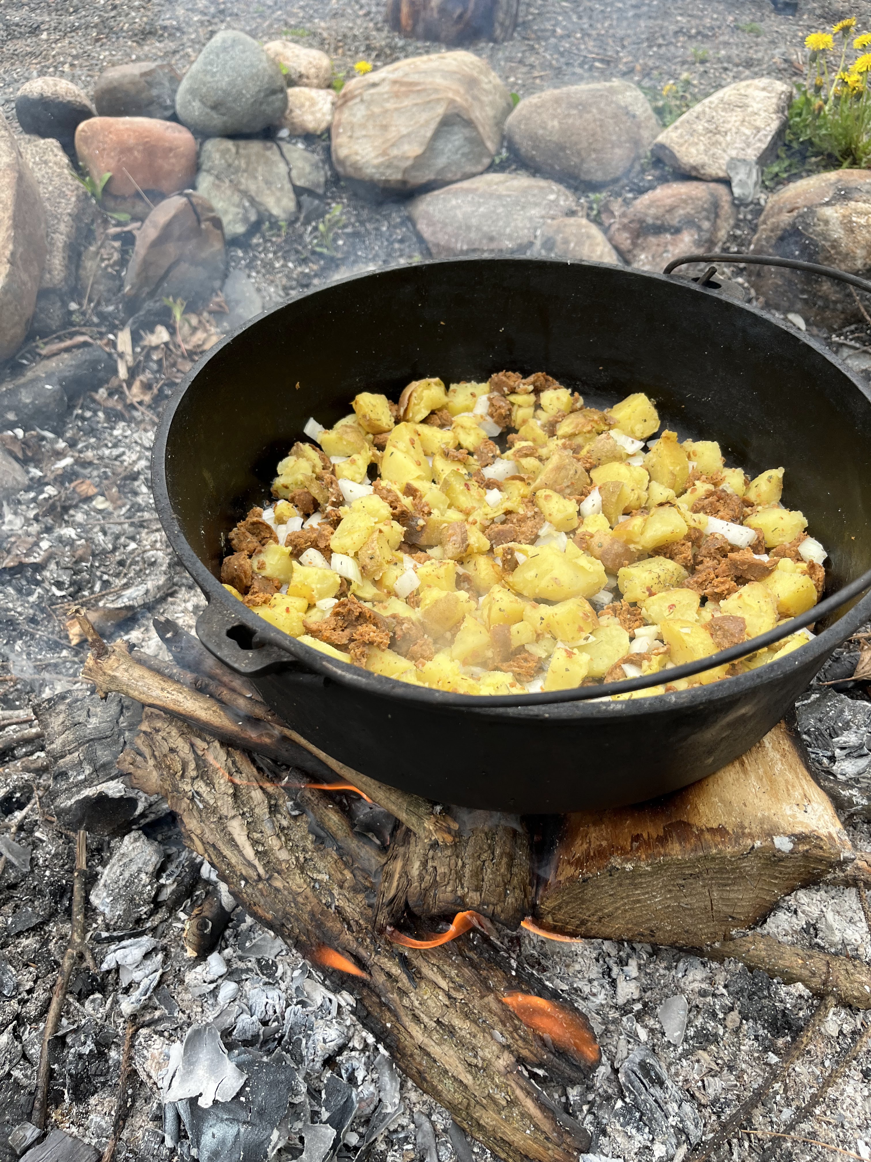 The cast iron is thick enough to spread the heat of a campfire fairly evenly across the bottom of the pan and the heavy lid on the Dutch oven allows foods to cook off the fire. We often pre-cook the breakfast sausage in the pan, then remove, and follow them with the potatoes and onions. When the potatoes are soft, we add back the diced (or whole) sausage, then remove the pan from the fire and add the eggs, allowing them to cook in the residual pan heat with the cover on.