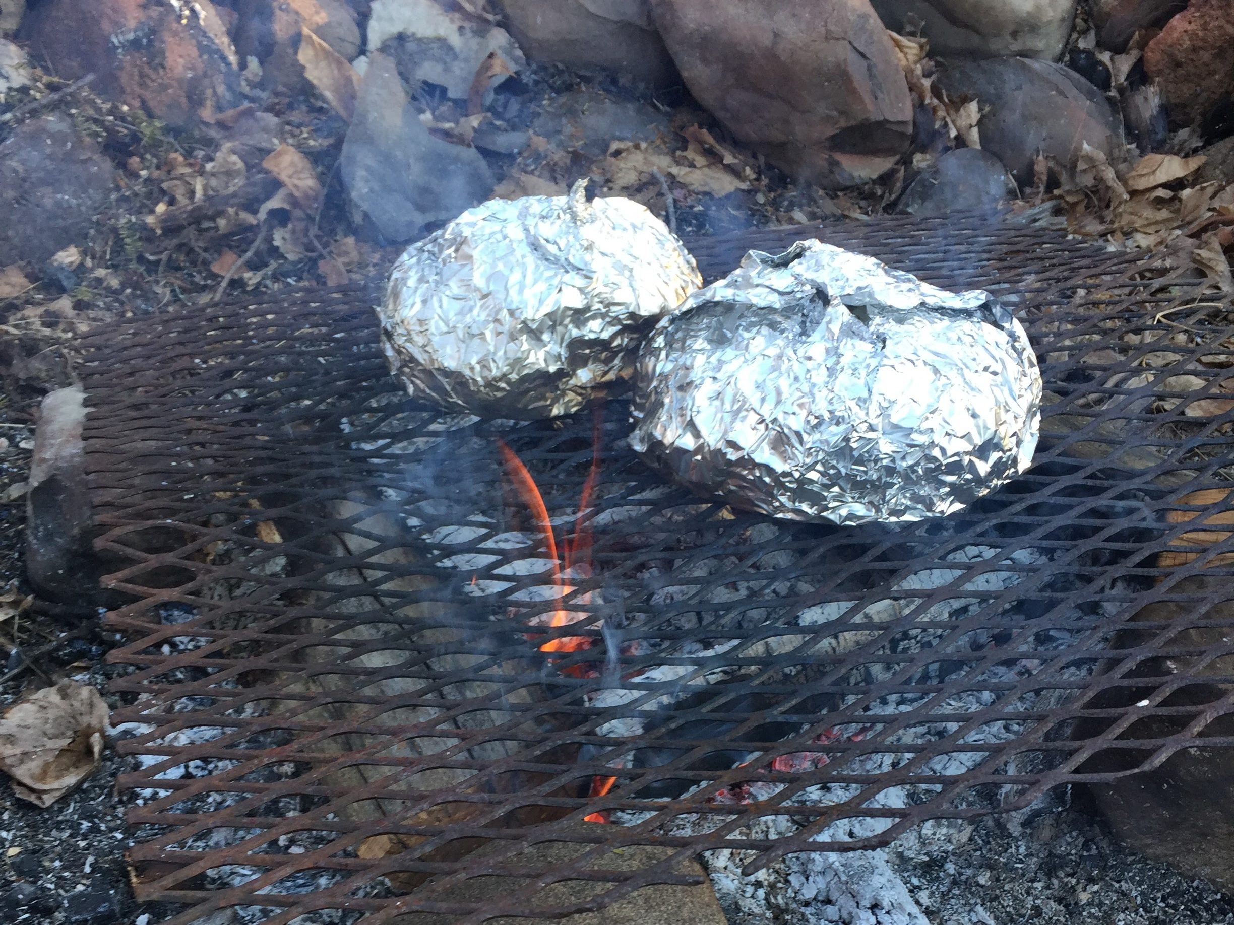 Ensure your cast iron pan is really well-seasoned. If you need help, Lodge has a helpful article here. We seasoned ours a bit longer than recommended on the gas grill prior to the campfire use in order to ensure a really good, near non-stick base coating. We still use a healthy amount of butter or oil when cooking potatoes or eggs.
