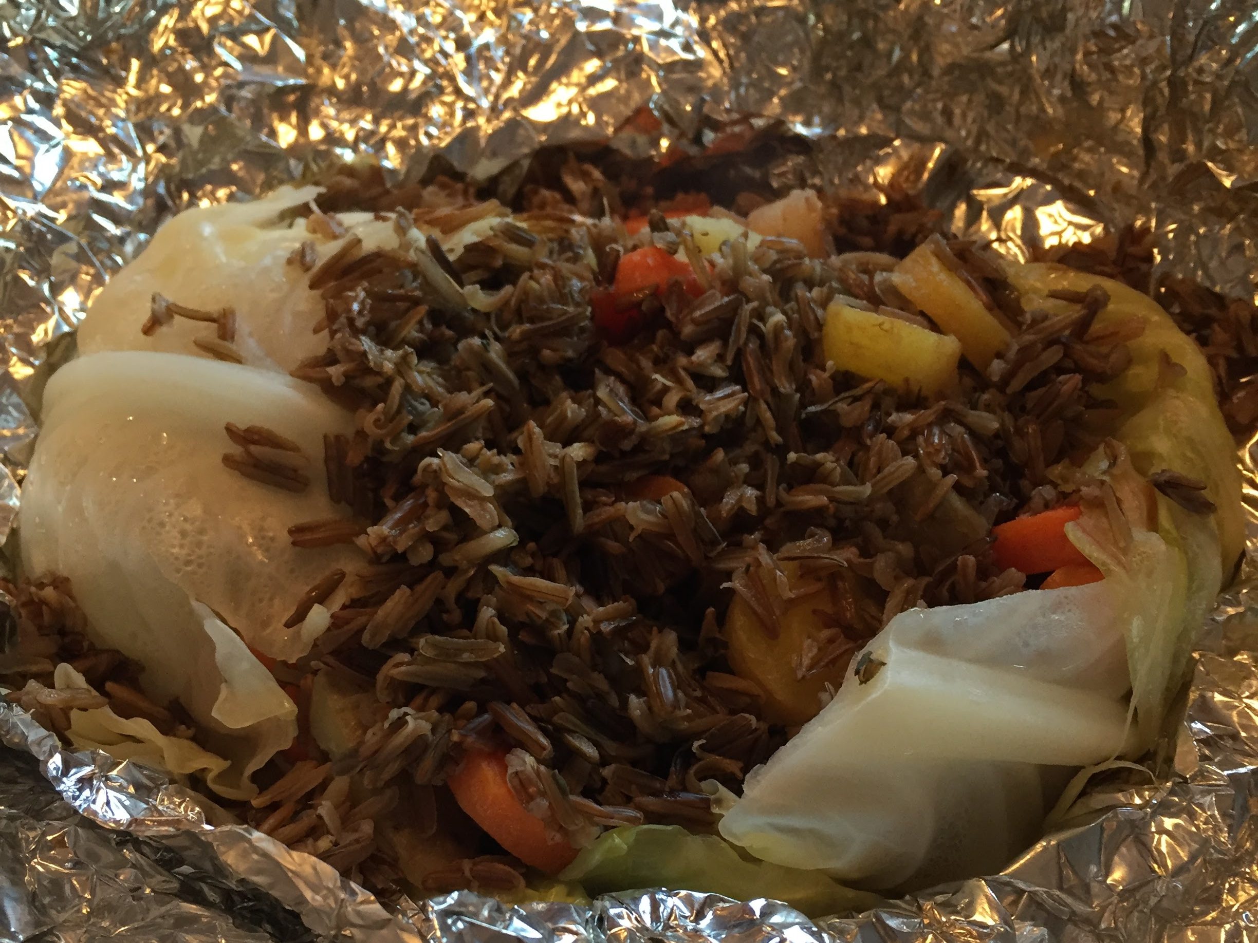 Here we went with a wild rice along with onions, carrots, and potatoes to create almost a campfire, fried rice effect. The foil seals in steam to cook the package faster. The cabbage provides liquid that converts to steam, a bit of flavor, and a buffer against charring the food. Most often the bottom leaf or two of the cabbage remains uneaten as it is often charred to the foil. Par-cooking the potatoes can be done a few ways – place them in the cooling embers of last night’s fire, pre-boil them until just softening over the campfire in a pot, or simply boil them stove-top prior to the camping trip and keep them cool along with the protein of choice. Cook time is more art then science (more accurately it’s 100% science, but it’s hard to know exactly when they are done without piercing the foil wrapper) but you get a pretty good feel for it over time. Don’t hesitate to go more “low and slow” on the heat rather than trying to rush it.