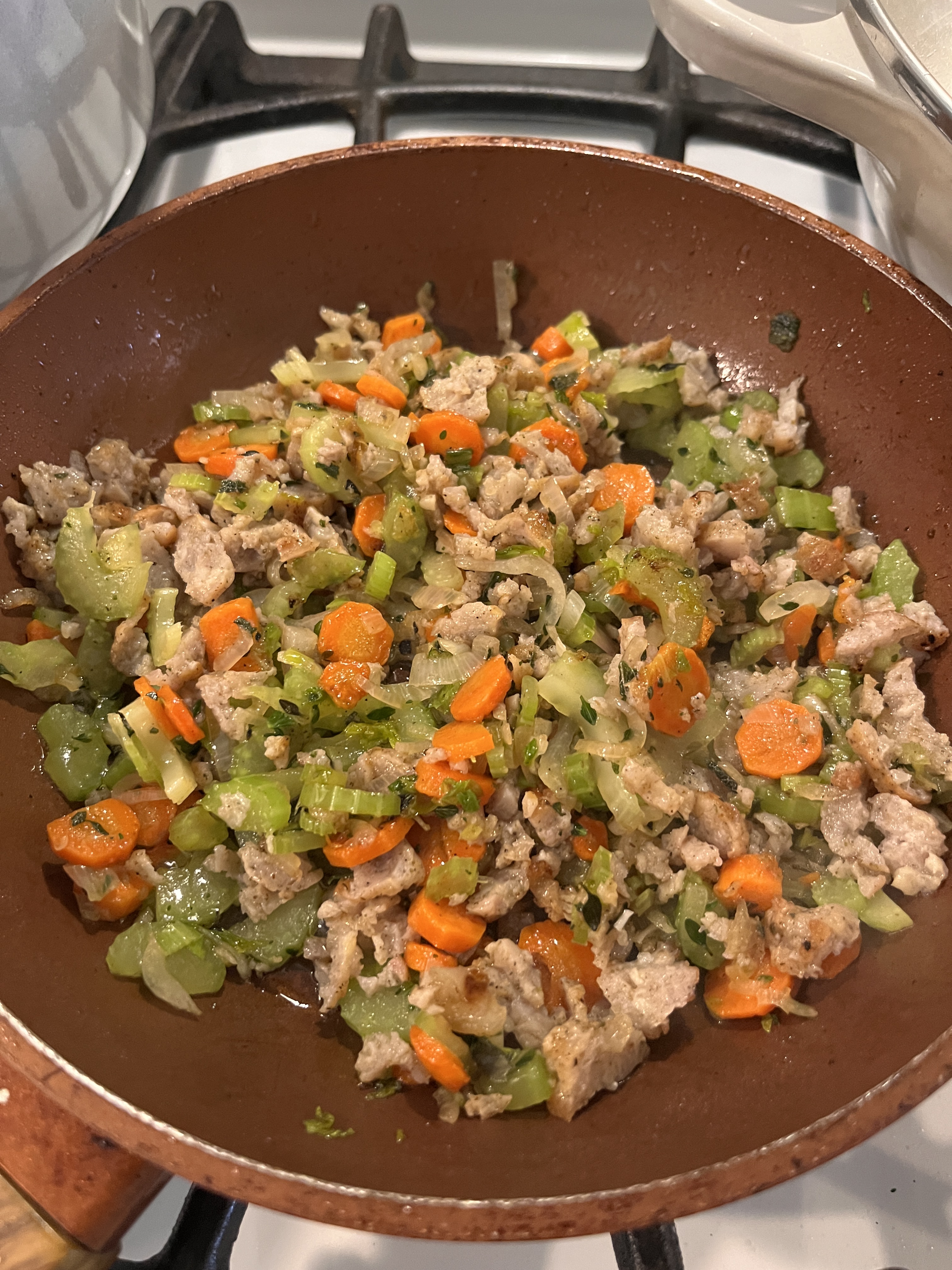 If using frozen chicken sausages, such as Applegate, cook to package directions in a skillet with 1 Tbs. cooking oil. Remove sausages to cutting board when cooked through. In the same skillet over medium heat, add shallots, carrots, celery with a dash of salt and sauté until soft and slightly caramelized, scraping up any chicken sausage bits as they cook. Add back diced chicken sausages and remaining 1/2 Tbs. of sage and thyme, cook for just 2 minutes more.