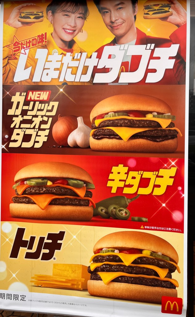 Yeah…those are garlic burgers at Burger King and McDonalds available in Kyoto (ninniku means garlic). I always love seeing how fast food gets adapted around the world. I have to admit, these look pretty tasty!
