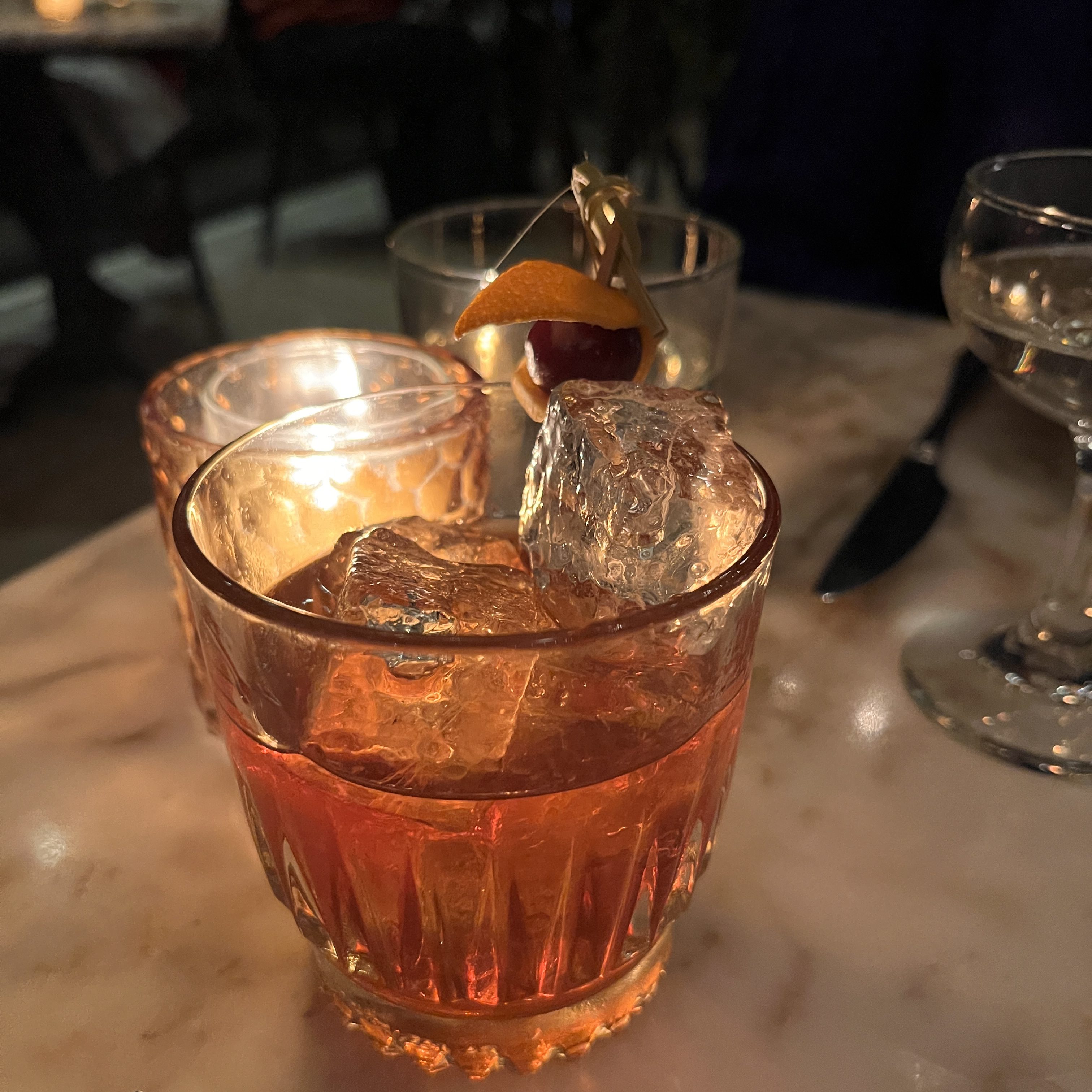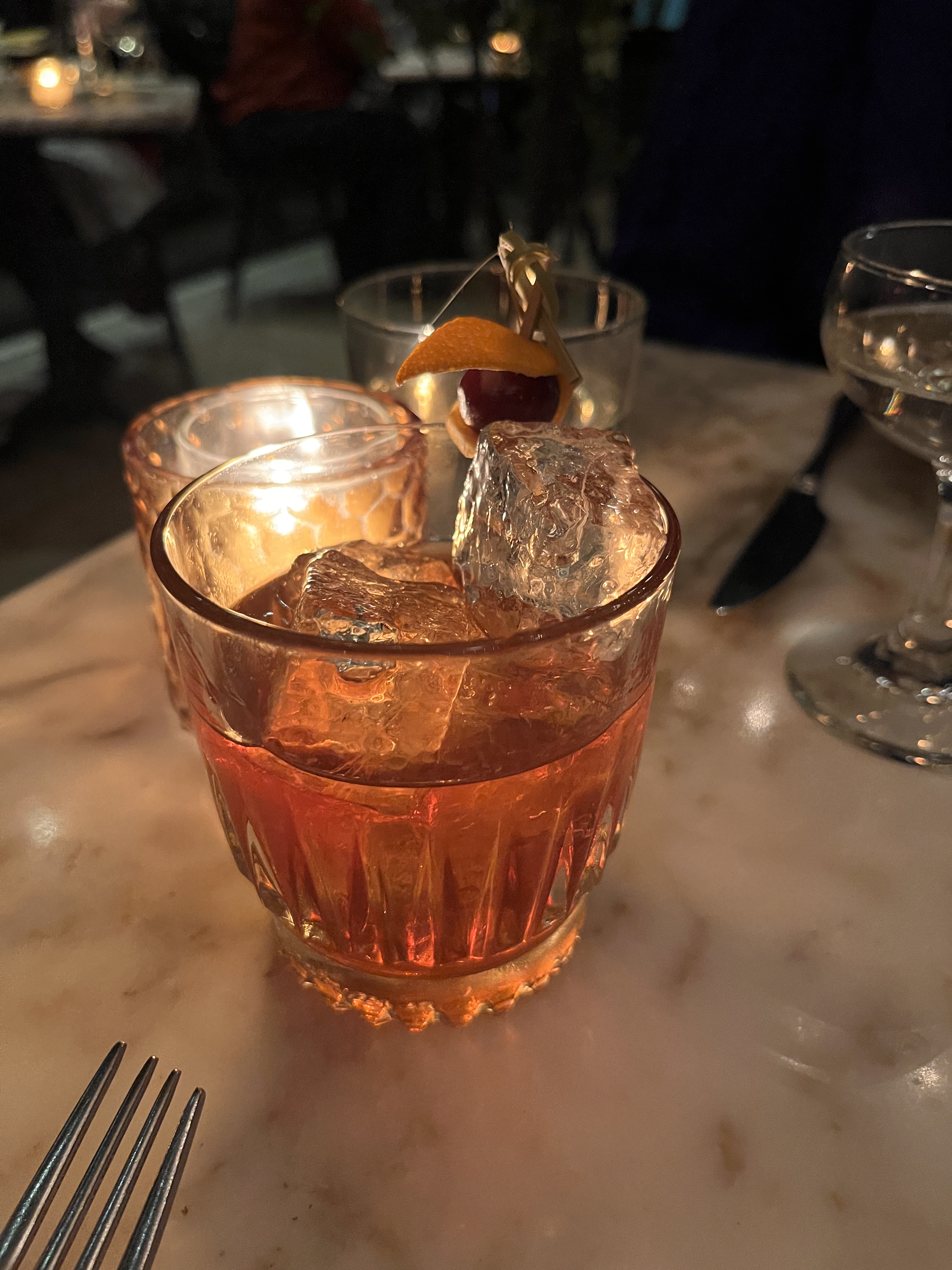 Of course we started with an Old Fashioned. Could a supper club dinner start any other way? (Well actually, the manager brought us a glass of Prosecco to celebrate our anniversary as we looked over the menu. I’m telling you, this was a great experience!) The Call Me Old Fashioned was rye, Amaro Montenegro, and bitters. Classic, solid opener.