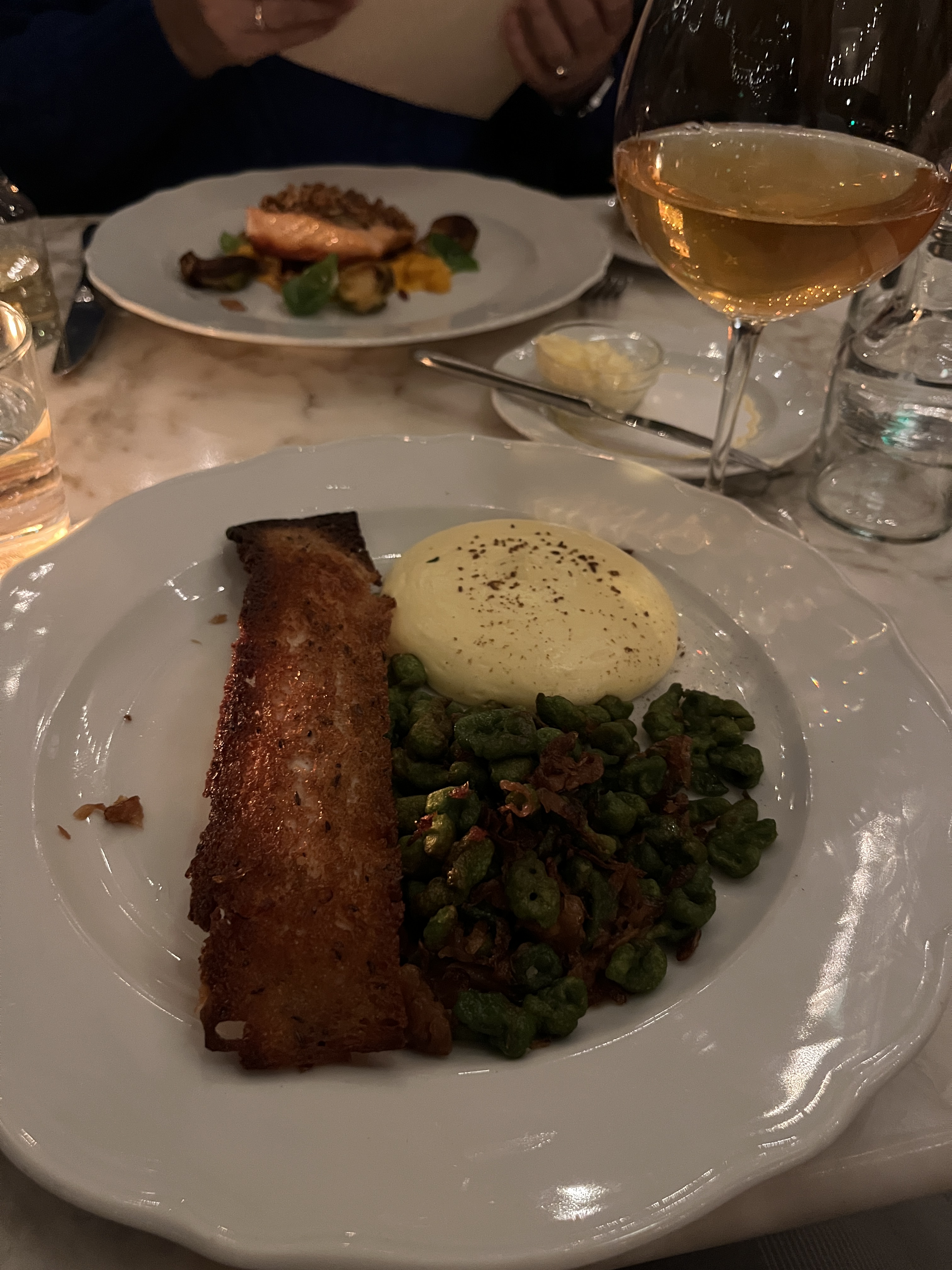This simple looking dish was a show stopper. The Lake Superior walleye was pan seared in butter with a rye cracker on the bottom, ladled with the hot butter until cooked through and then served cracker side up. That’s spaetzle on the right, presumably green with addition of Savoy cabbage. If you’ve followed along at home, you know we love our spaetzle. And then the real touch of brilliance – a horseradish sabayon.