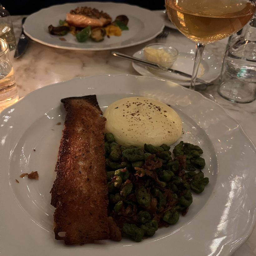 A toasted dark rye bread made into bread crumbs might also work in a pinch, but the crackers worked ideally in this preparation as you want that really crisp finish on the walleye. The choice of Harvey House to use a rye crust here is a fun bit of fish fry recombination. A very traditional fish fry would have walleye with a flour/beer batter coating and be served with a slice of rye bread. The rye becomes a crisp, flavorful coating instead in this interpretation. Loved this.