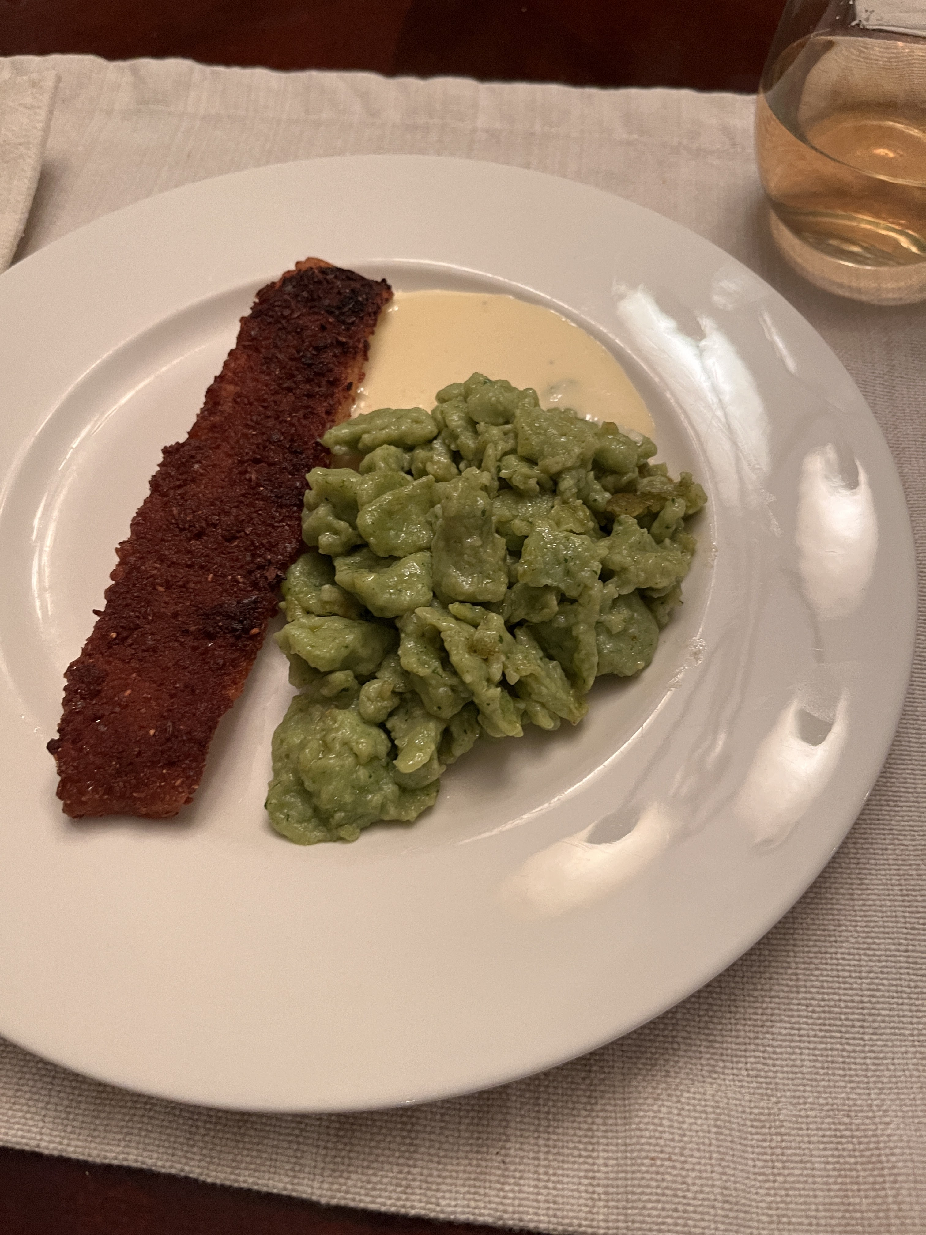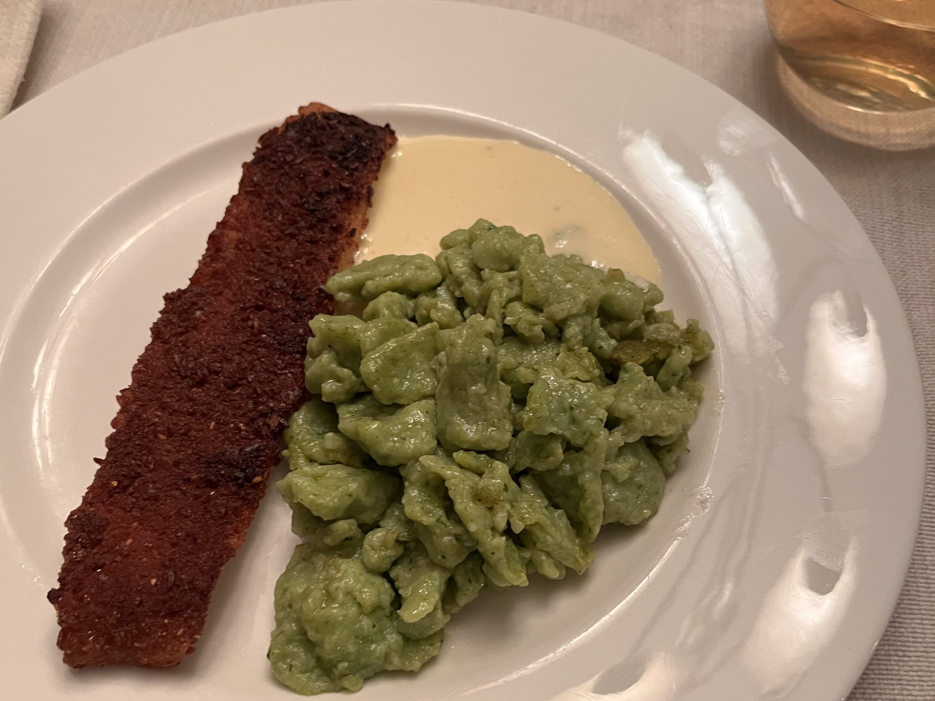 Remove fish from the oven. Gently flip the fish to serve on the plate crumb side up, with spaetzel and a dollop of sabayon sauce.
