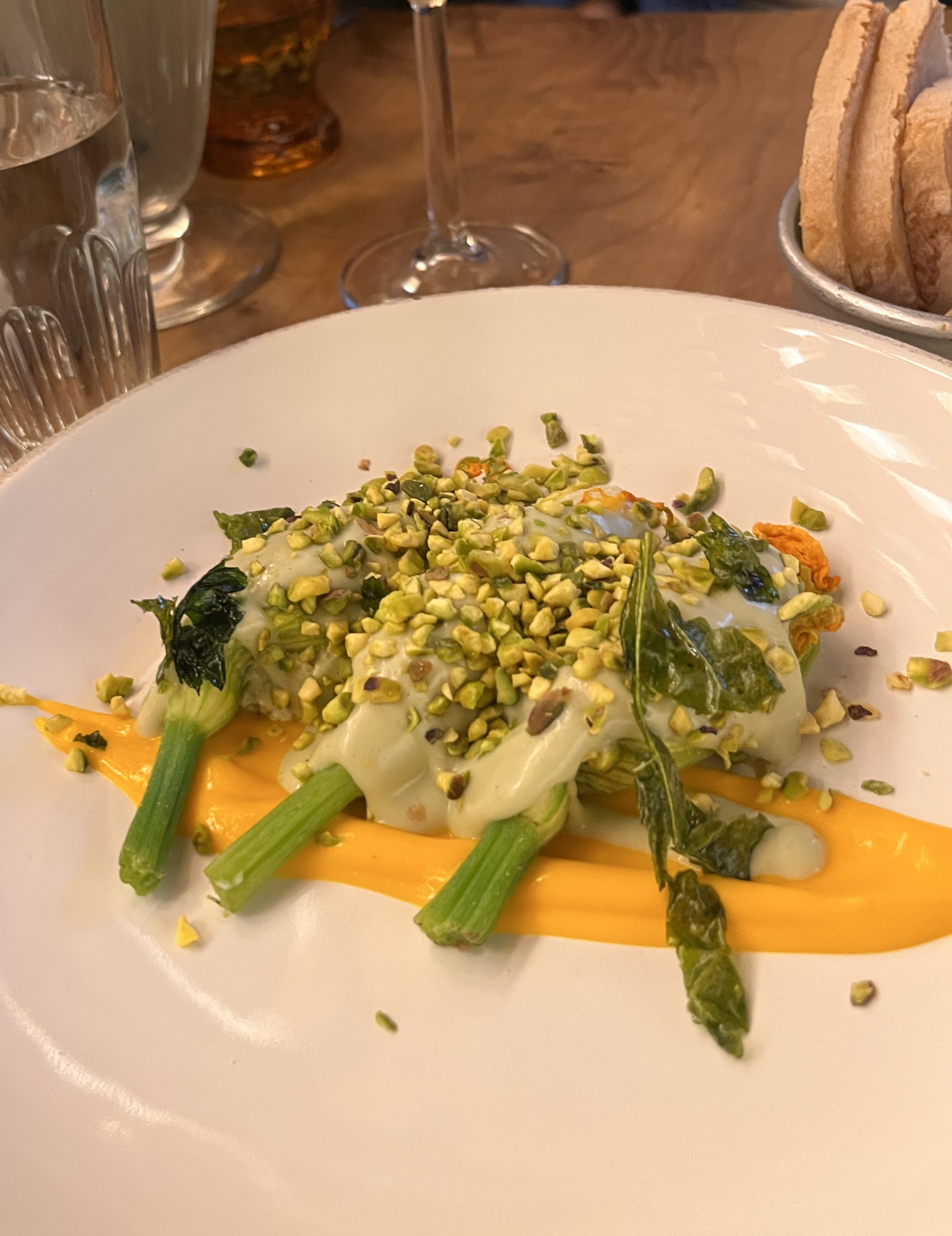 Our first appetizer was squash blossoms stuffed with fresh ricotta, topped with pecorino cream sauce, pistachios, and fried Italian parsley over a squash purée. It felt both fresh and decadent at the same time, and hinted at the the full flavors to come.