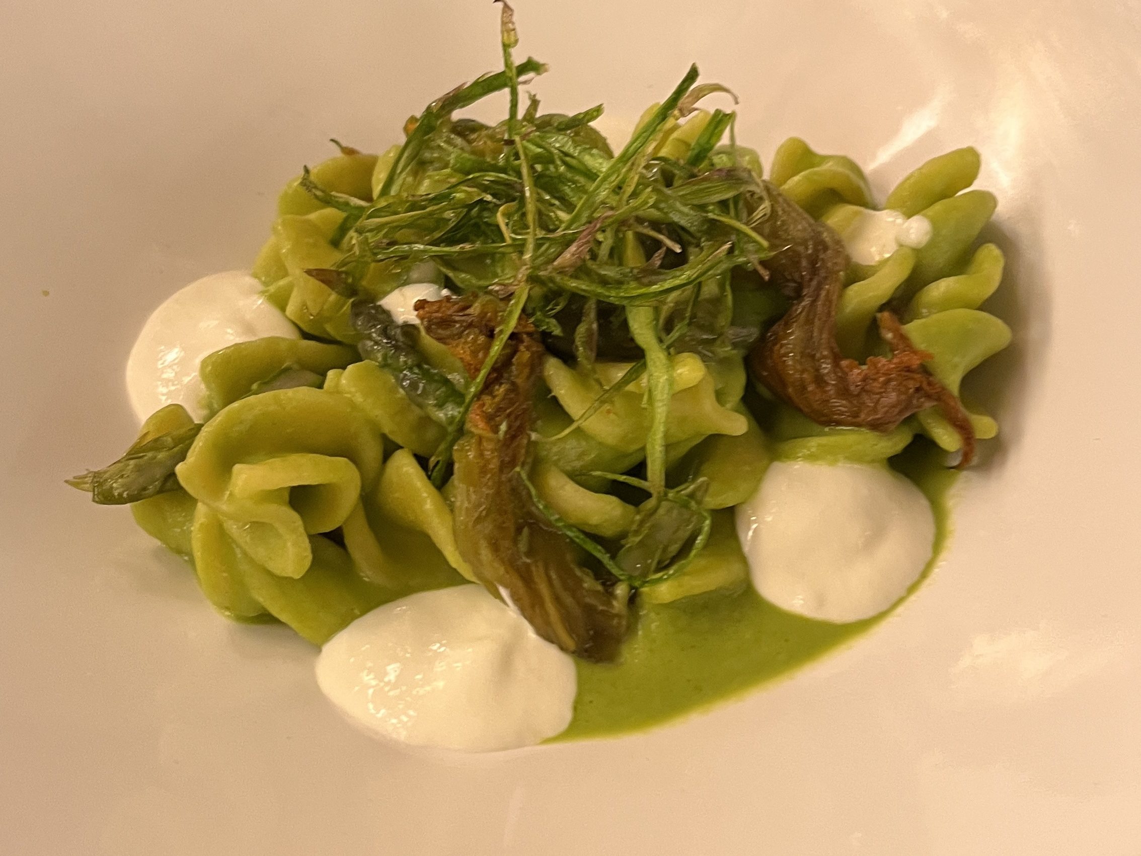 Then a fusilloni pasta with an asparagus and basil purée, pan-fried asparagus tips, fried squash blossoms, topped with fried leeks, and accompanied with dots of whipped ricotta. Again, fresh and decadent…freshly decadent(?).