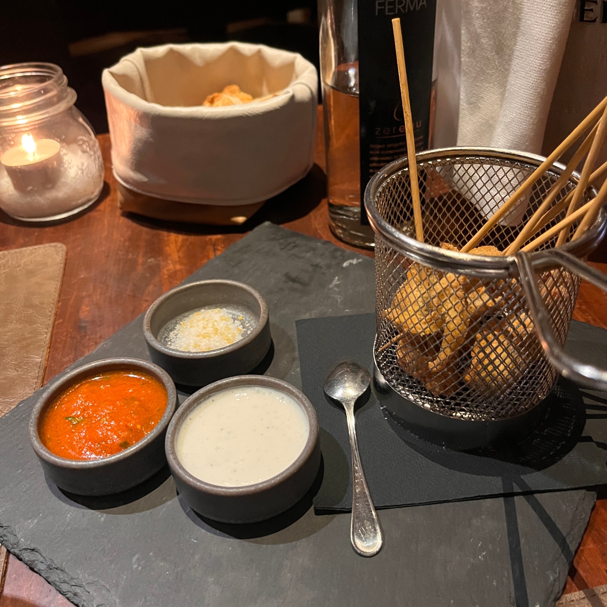 We enjoyed another Vermentino – a 2023 Occhione from vineyards in Bibbona, Italy. It paired beautifully with the fried fresh anchovies served with a choice of fresh tomato romesco, yogurt sauce, and lemon salt for dipping.