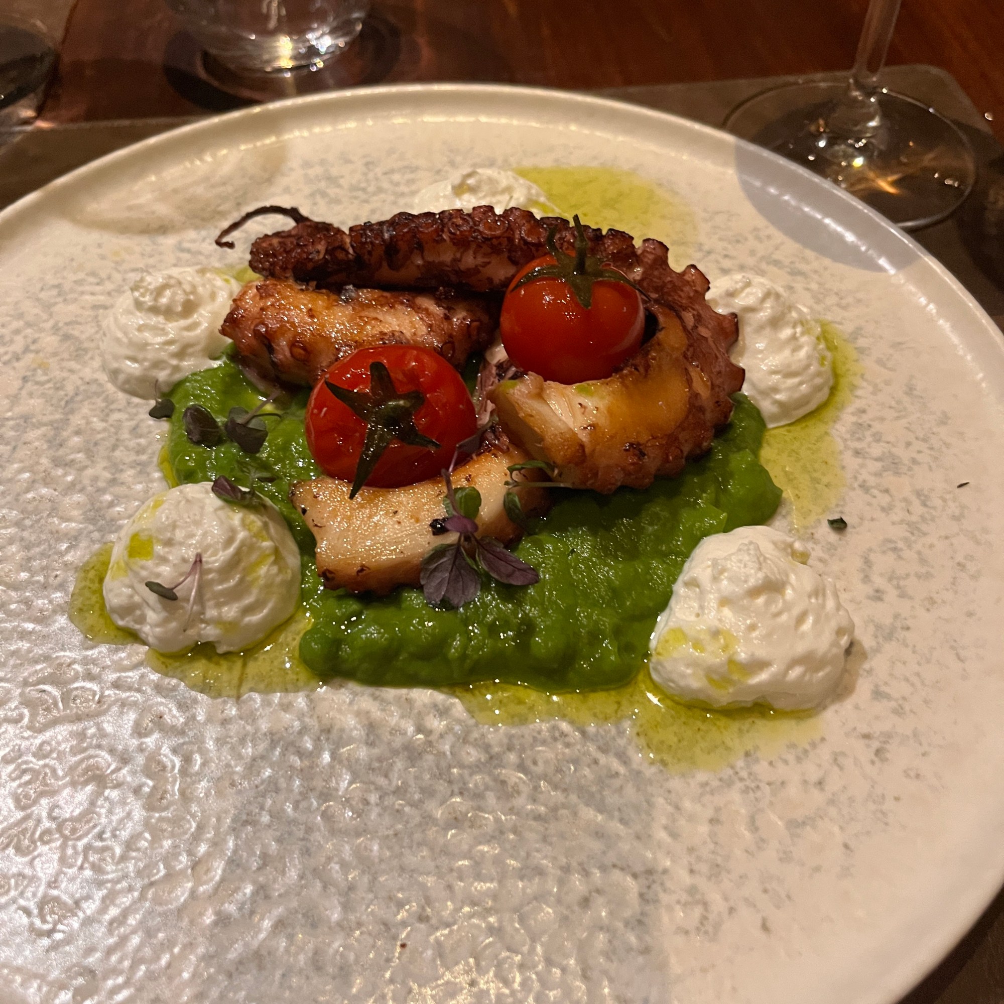 Our centerpiece in the tableau above is a stunningly tender octopus served on a purée of peas with whipped ricotta and confit tomatoes and olive oil. Peas were seasonally fresh and the whipped ricotta added a lovely creamy accent.