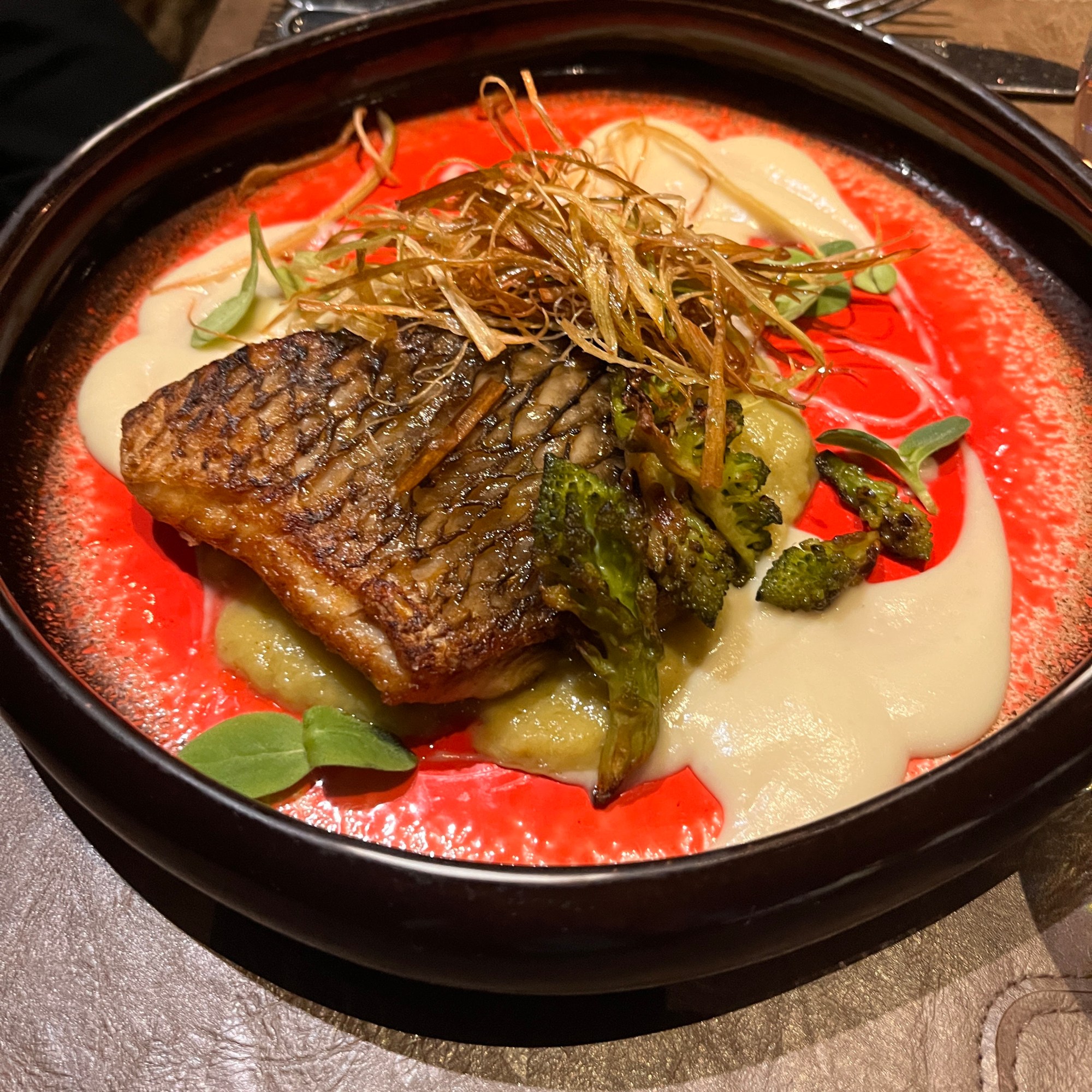 Our other entree was croaker on puréed asparagus with roasted romanesco broccoli with pecorino cream and fried leeks. Croaker is in the same family as sea bream or drum, a delicate, white flaked fish paired here with a seasonal asparagus purée. Note: the red surrounding the dish is actually the stunning plate it was served on.