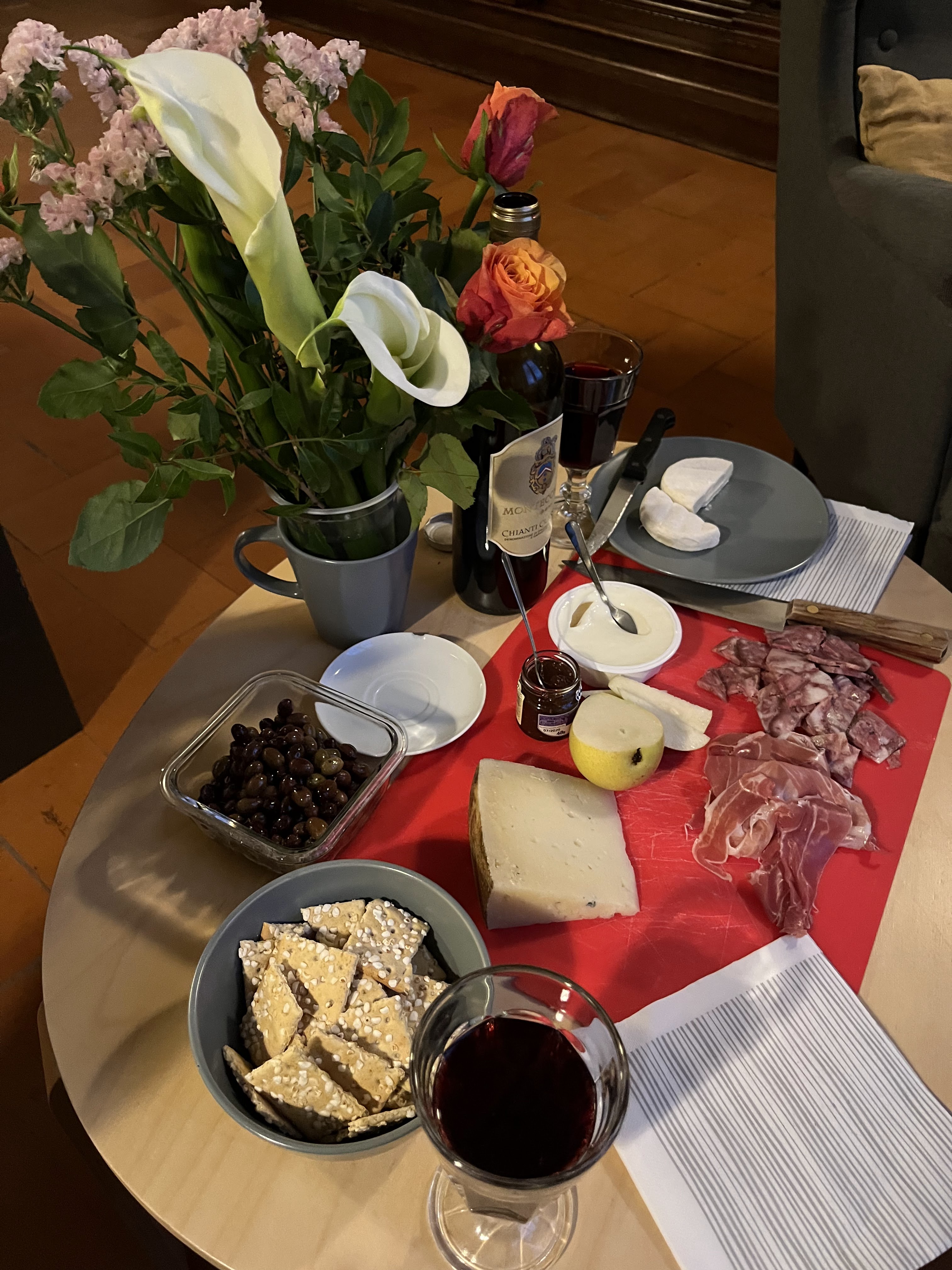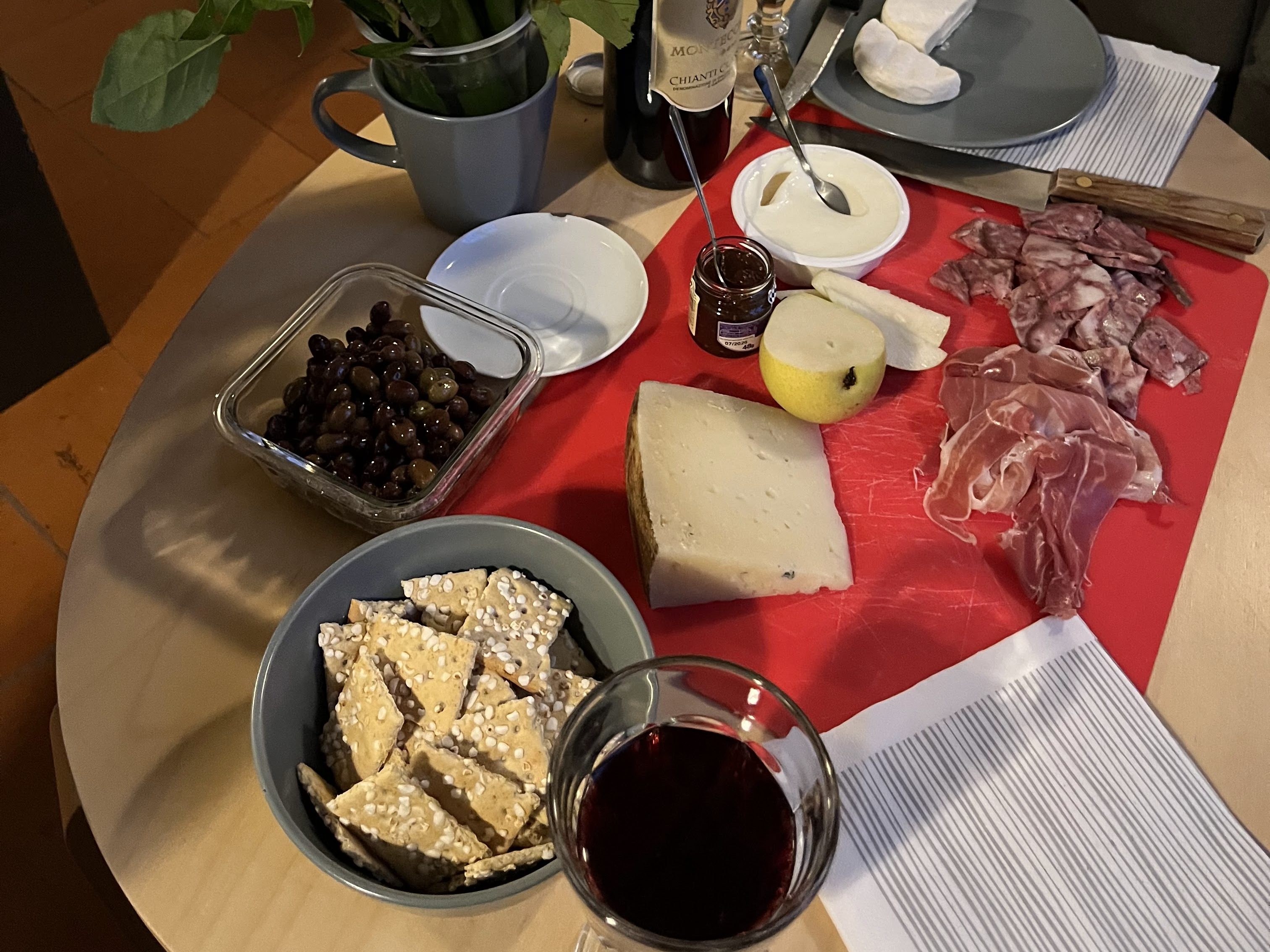 One of our favorite traditions is to open a trip with a cheese and charcuterie of local selections. On the table pictured above, we have a Chianti Classico alongside our Soppresseta Toscana, Prosciutto di Parma, a local pecorino (more on that in a future post), sesame crackers, local olives, a fig preserve, and slices of pear. That soppresseta also found it’s way into a pan of scramble eggs with a soft ripened cheese the next morning. Delicious both ways we enjoyed it.