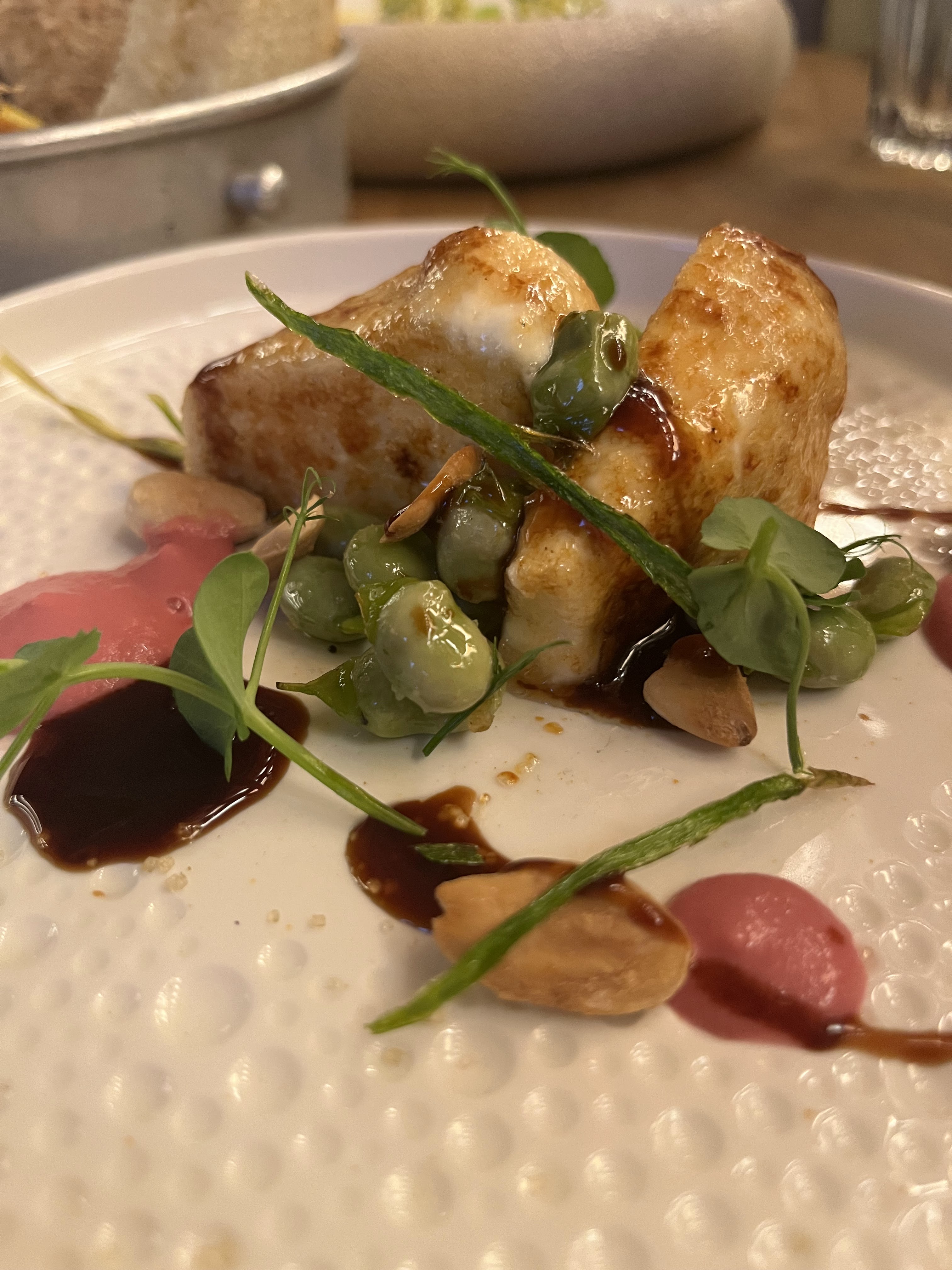 Then a carnolli rice risotto with pea purée and a Calabrian nduja cream sacue spotted with olive oil, peas, and topped with pea shoots. Nduja is a soft, spreadable pork salmi from Calabria which added just a hint of spice to an otherwise richly decadent (fresh!) pea risotto.