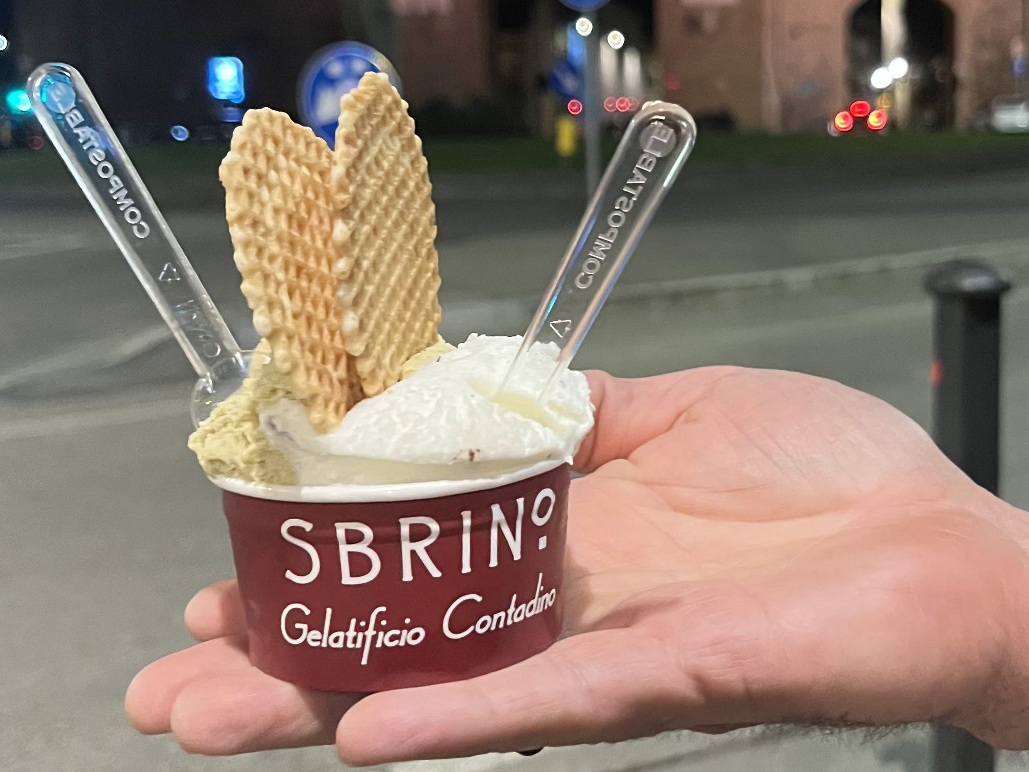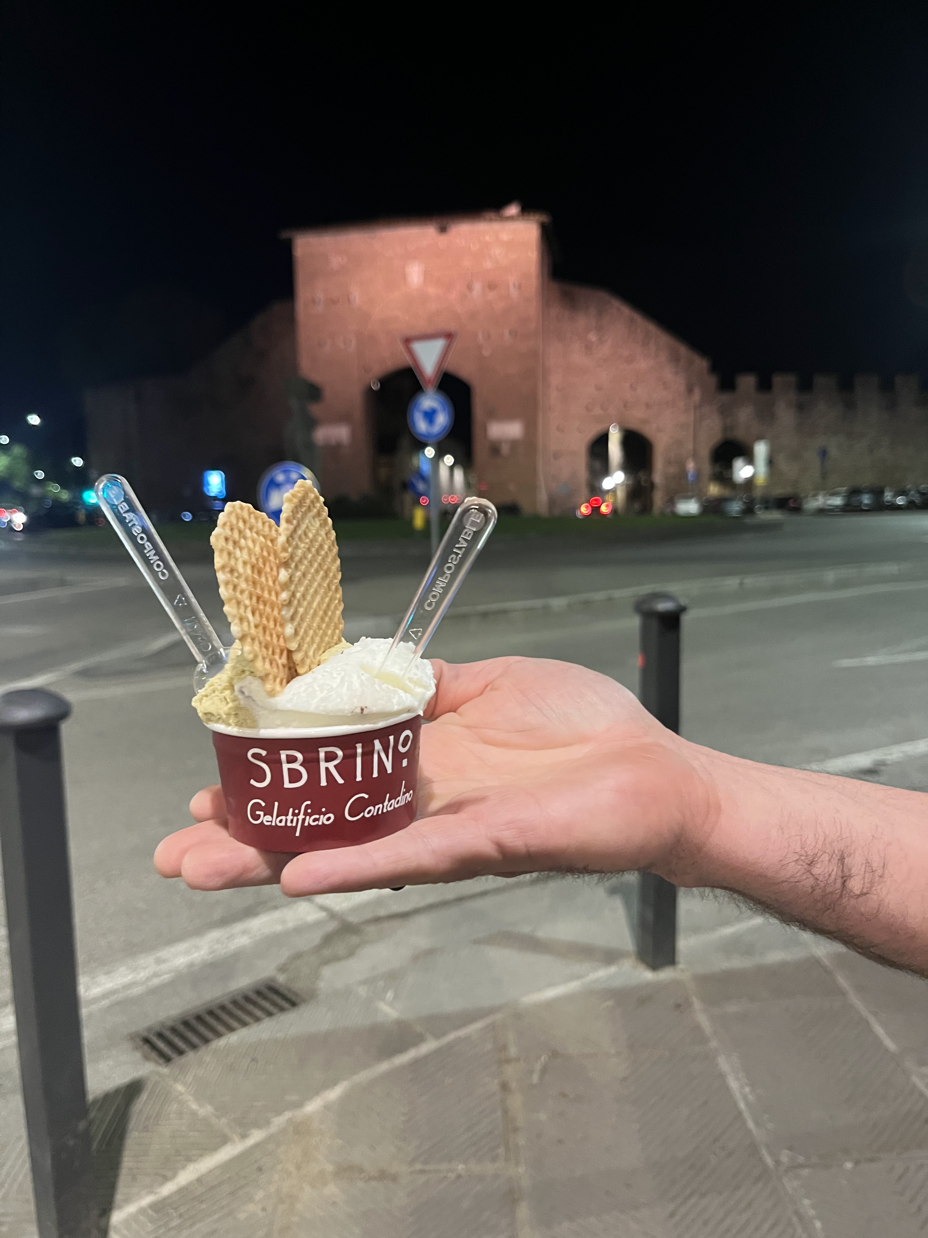 For all the richness, with cheese featured in every course, the fresh garden offerings really took center stage. The accents of whipped cheese, balsamic vinegar or pepper cream heightened the appreciation of what the garden provided. We were definitely not feeling heavy, or weighed down by a big meal. In fact, we still had room for one more small sweet treat – pistachio gelato from Sbrino Gelatificio Contadino.