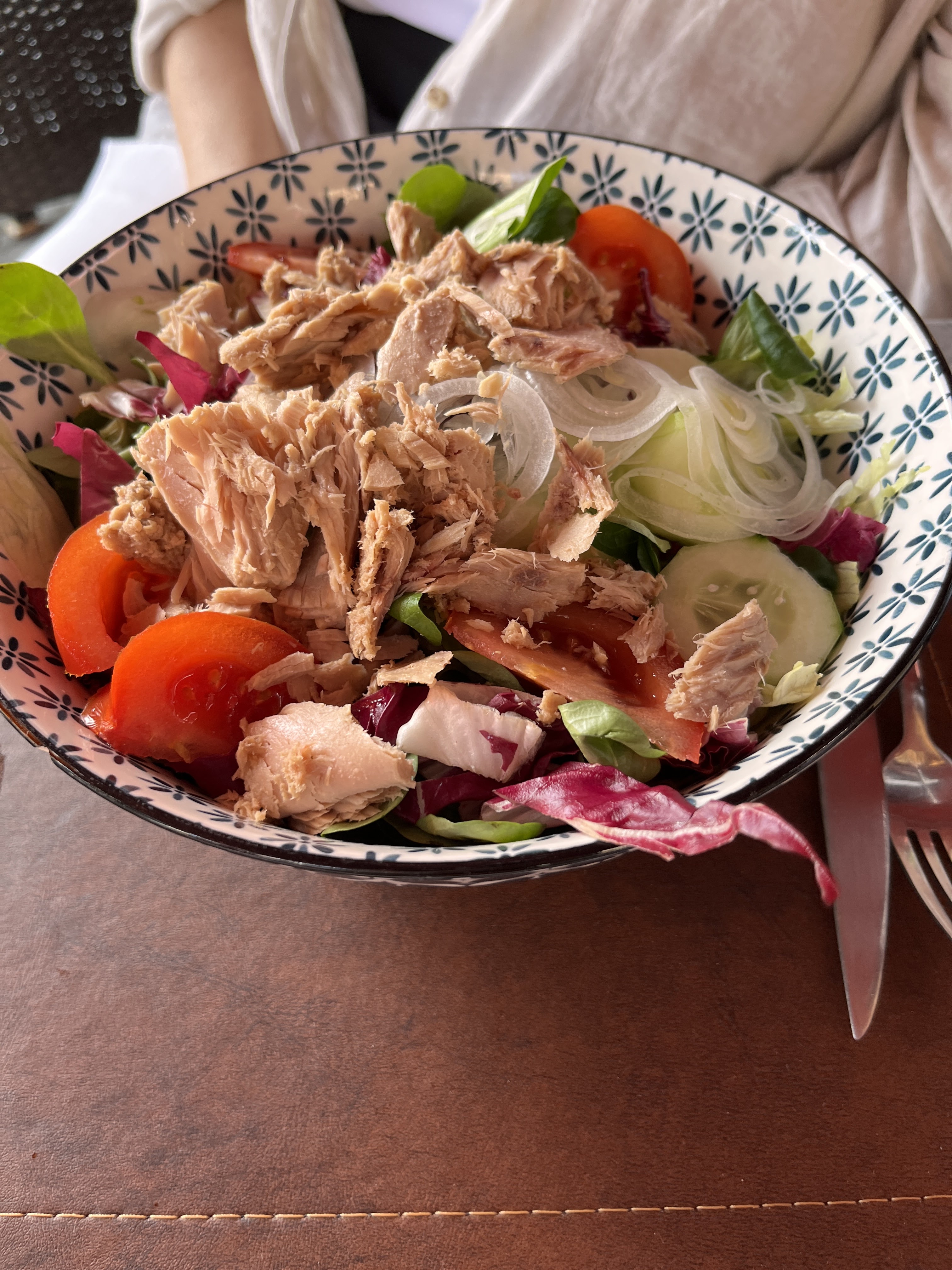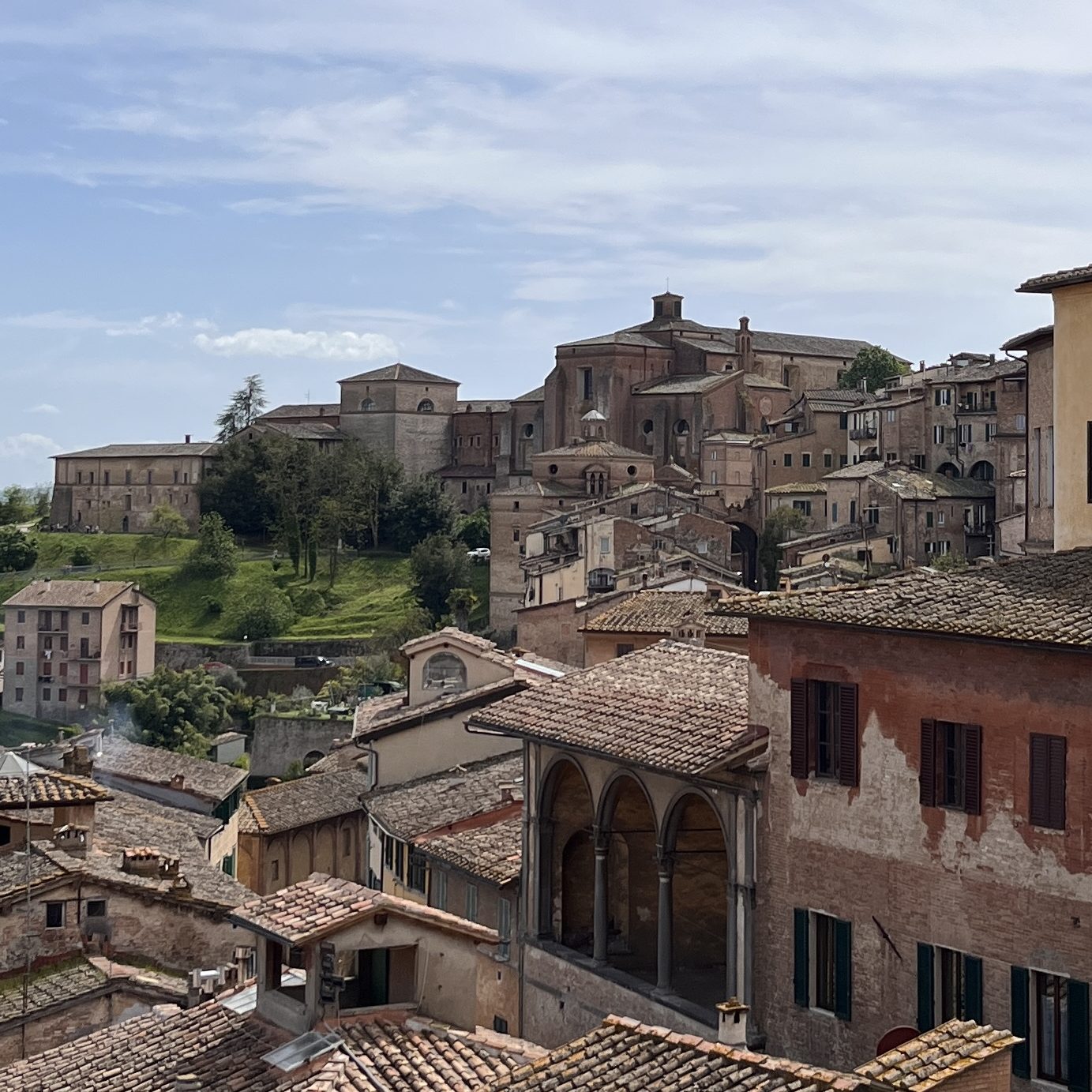 This is an ancient town, built on the top of a hill by the Estruscans before being settled by the Romans. The center of the town is the sunken Piazza del Campo surrounded by an wide walking path. There is a horse race held here twice a year, called the Palio di Siena, with representatives from the towns different districts racing for nothing more than bragging rights until the next race. But on our visit, the piazza is surrounded instead by outdoor dining where we enjoyed cocktails and a light lunch. We had a tuna salad, which features tuna jarred in Italian olive oil for a firmer texture.