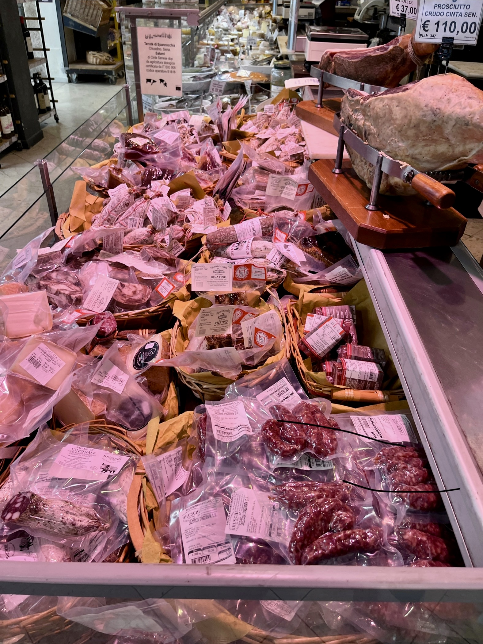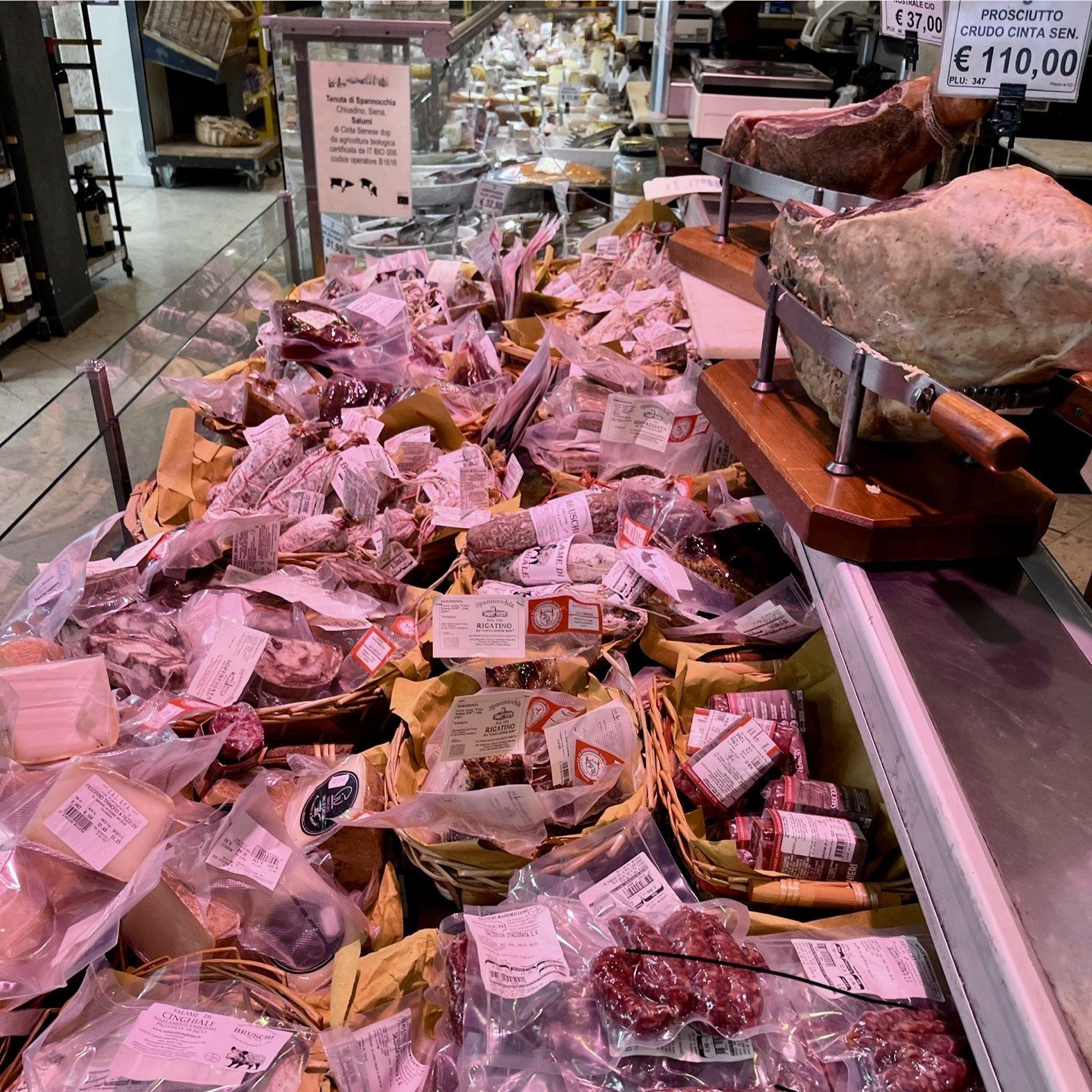 In addition to a local pecorino and an aged variety, we also found the Pecorino Foglie di Noce, which is aged in caves and wrapped in walnut leaves. In addition to the incredible selection of different pecorinos from the area, we also had our choice of any of the local salumi as well.