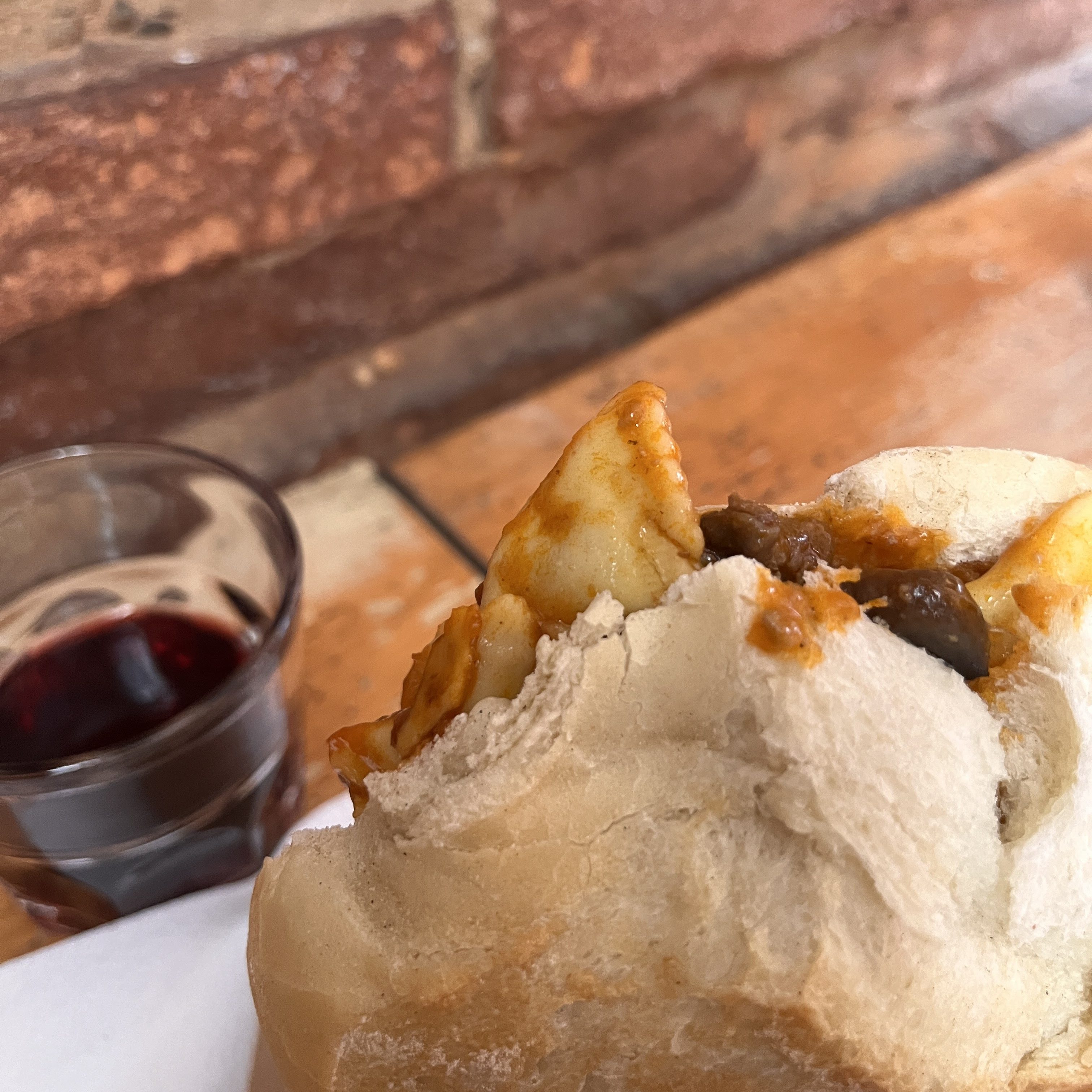 I had a sandwich of wild boar ragu with ravioletti (small ravioli) and the house wine. Unless you have already discovered the Spaghetti Grilled Cheese, the idea of pasta on a sandwich may seem strange. The roll was a traditional Tuscan bread, which is unsalted, but the wild boar ragu was stunningly flavorful and the ravioletti the perfect addition of cheese. It was like comfort food from a childhood I never lived.