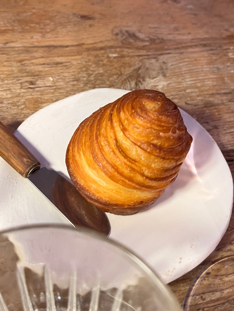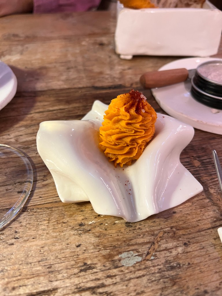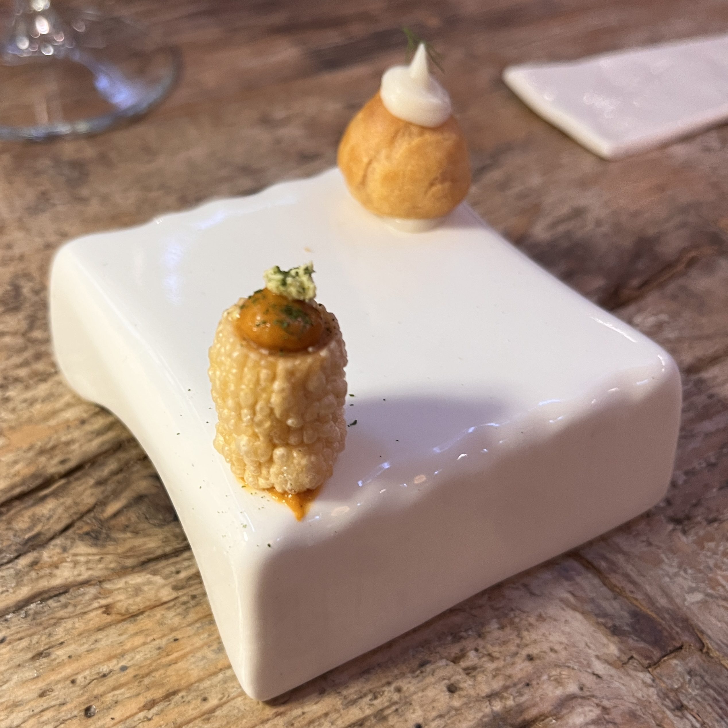 After some conversation about our preferences and the direction of the menu, the wine suggested was a Crocus 2021 – Reserve Vernaccia di San Gimignano, from Casa Alle Vacche. The vineyard suggests the following parings: “Seafood appetizers, shellfish, baked fish, semi-aged cheeses. Excellent also as a meditation wine or with spicy and complex dishes.” Ah, a meditation wine, I like the sound of that. Given the direction of the tasting, this was a perfect pairing.