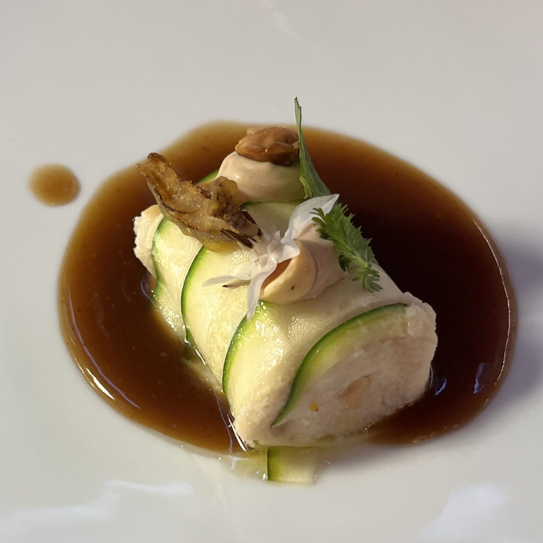 The first dish of the tasting was cod mousse wrapped in a thin, poached zucchini on a red onion broth reduction topped with a fried zucchini flower and an edible flower. Conceptually, prepared like a manicotti, but in in flavor, something all together new. The depth of umami, roasted flavor in the red onion reduction was a lovely, rich counterpoint to cod mousse.