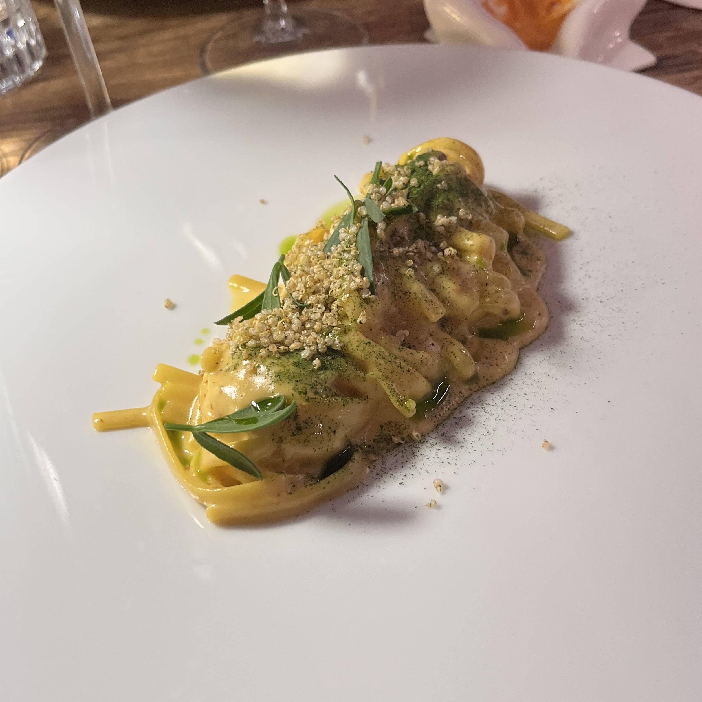 Next was a linguine with sea urchin cream sauce. Yes, a sea urchin cream sauce! A bit of puffed couscous, tarragon, and an herb oil finished the dish.